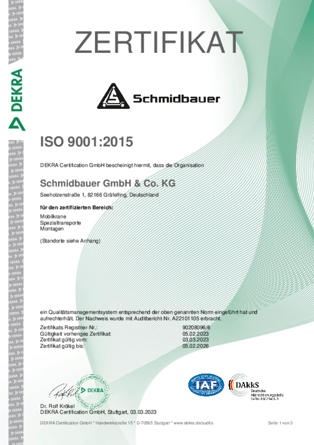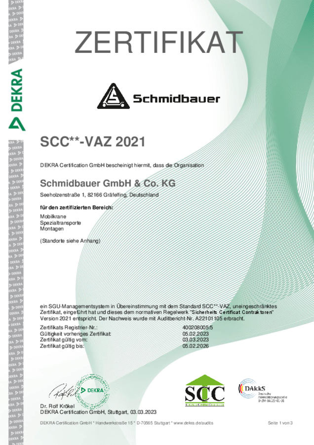 Die Schmidbauer GmbH & Co. KG freut sich Ihnen mitteilen zu dürfen, dass das Zertifizierungsverfahren mit der DEKRA Certification GmbH abgeschlossen wurde. Die Zertifizierung erfolgte gemäß den Standards ISO 50001:2018, ISO 9001:2015 und SCC** VAZ 2021.