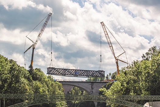 Das historische Wahrzeichen der Ingenieurbaukunst, die König-Ludwig-Brücke in Kempten, wurde mit dem Bayerischen Denkmalpflegepreis 2020 in der Kategorie „Öffentliche Bauwerke“ ausgezeichnet. Als 2015 entschieden wurde, die Brücke für Fahrradfahrer und Fußgänger zu sanieren, war Schmidbauer ein wichtiger Teil dieses großartigen Projekts. Die Herausforderung des spektakulären Einsatzes im Juli 2017 lag darin, die teilweise massiv beschädigten Bauteile der Brücke in drei Teilen herauszuheben, um diese in eine nahegelegene Feldwerkstatt für die umfassenden Sanierungsmaßnahmen zu transportieren. Nach der aufwendigen Instandsetzung wurden die einzelnen Brückenteile im Juli 2018 in Millimeterarbeit wieder eingehoben.