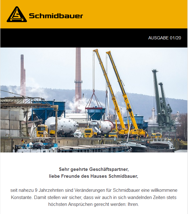 wir freuen uns sehr darüber, Ihnen unseren neuen Online-Newsletter vorstellen zu können. Damit möchten wir gerne aktuelle News aus der Schmidbauer-Gruppe mit Ihnen teilen und Sie in regelmäßigen Abständen zu den neuesten Projekten, Einsätzen, Veranstaltungen u.v.m. informieren.