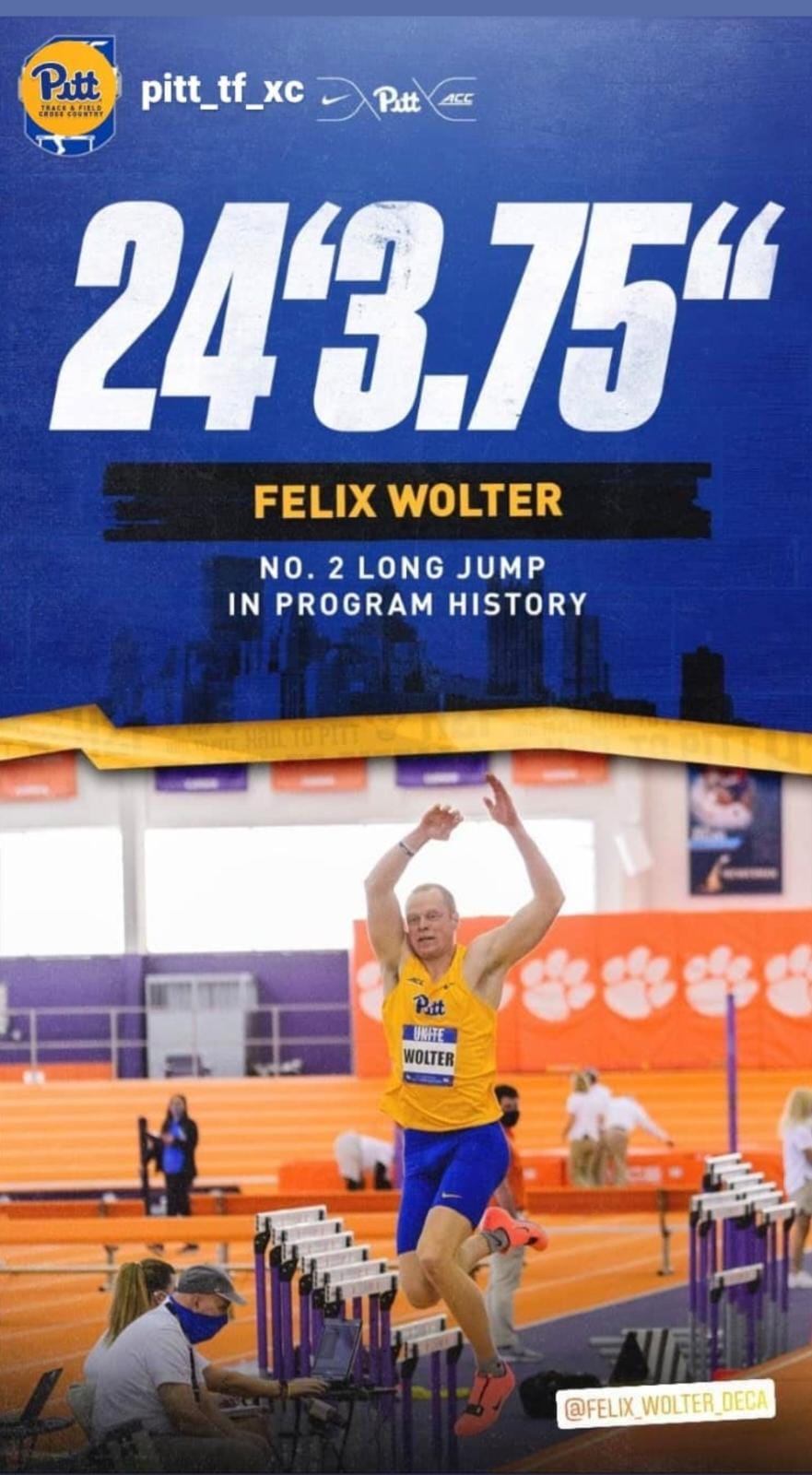 Unser Mehrkämpfer Felix Wolter des Team Schmidbauer aus dem TSV Gräfelfing ging für die „University of Pittsburgh“ bei den „Indoor Championship Atlantic Coast“ in Clemson, SC, USA an den Start und glänzte mit zahlreichen Topleistungen.