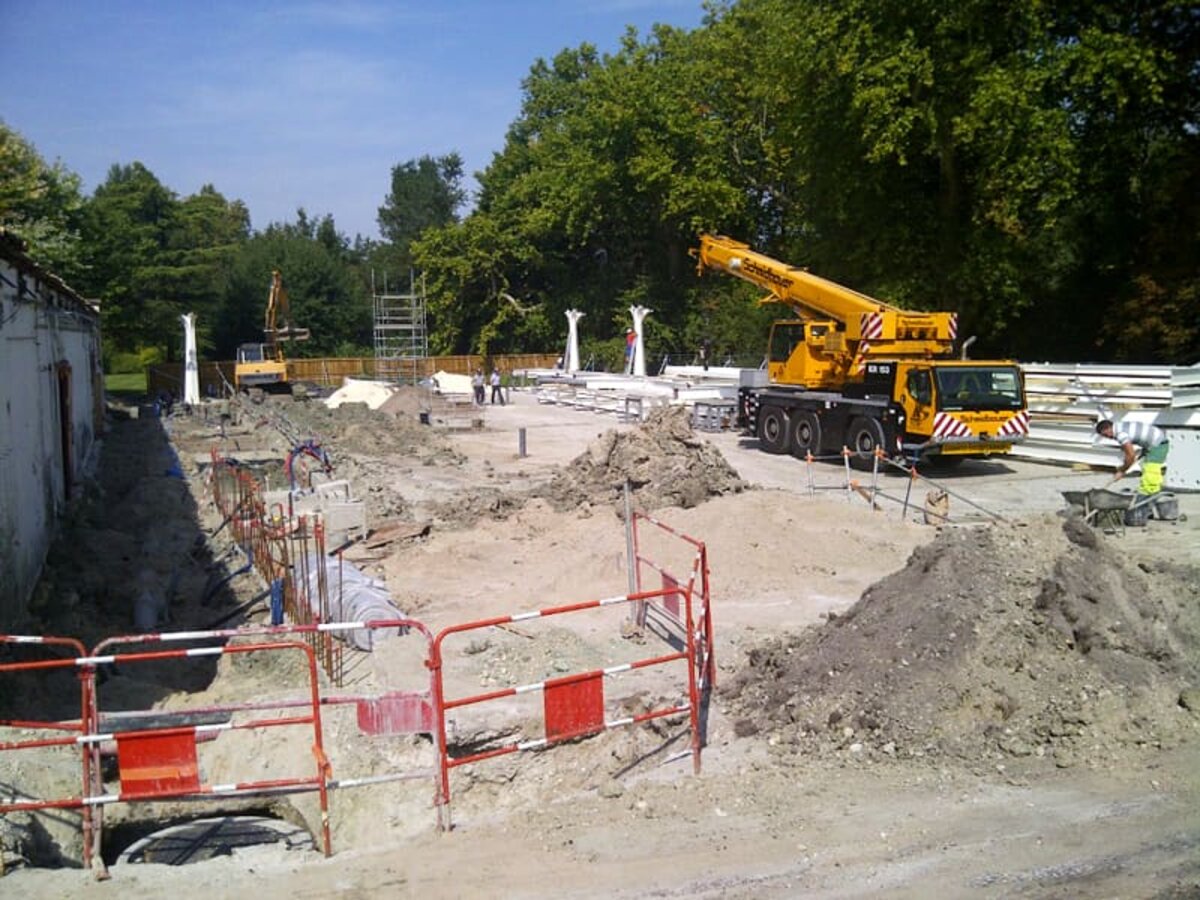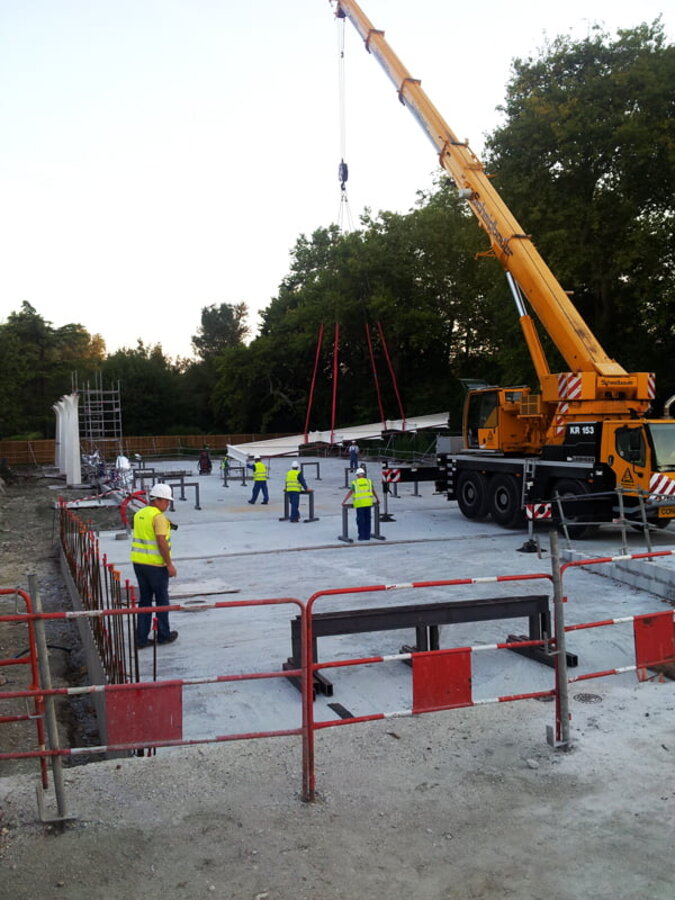 Nachdem in den Vorjahren jeweils ein Betonboden zur Ernte eingebracht und anschließend wieder entfernt werden musste, beschreitet man nun neue Wege. Die in einer Baumstruktur gehaltene Stahlkonstruktion inklusive Glasdach entstand unter unserer Mitwirkung.