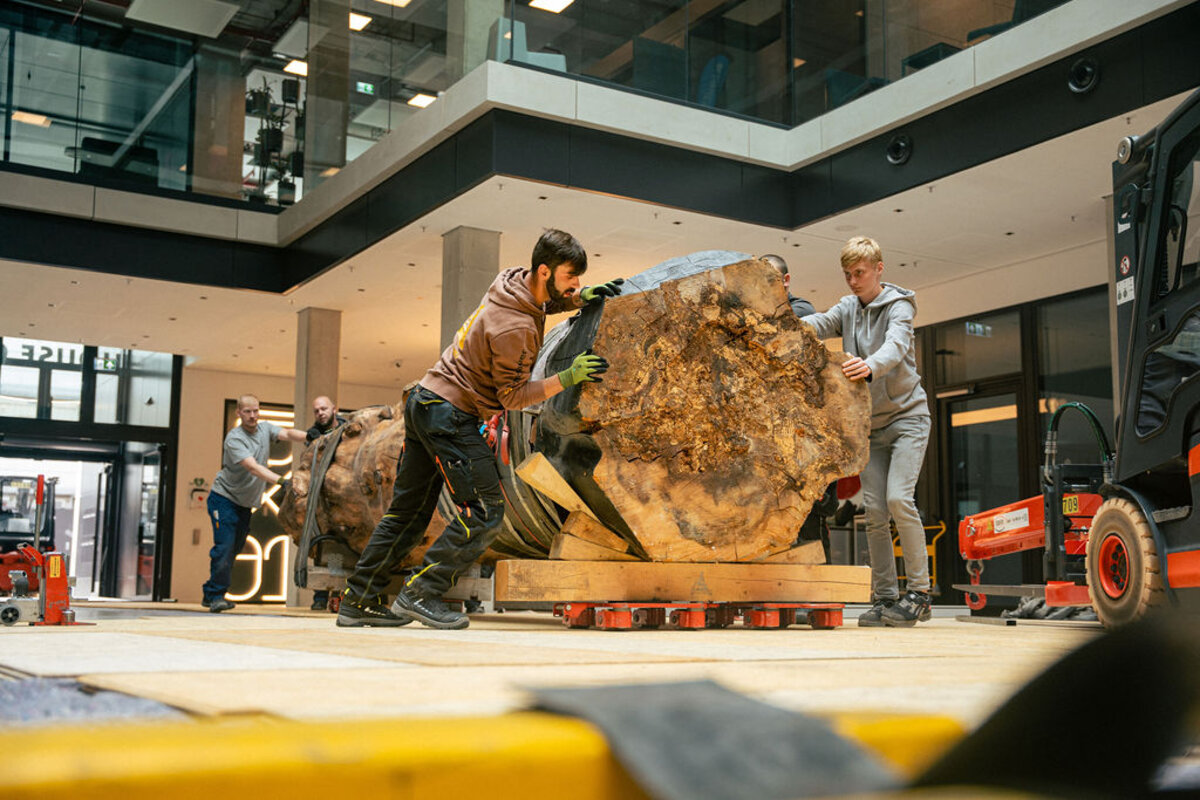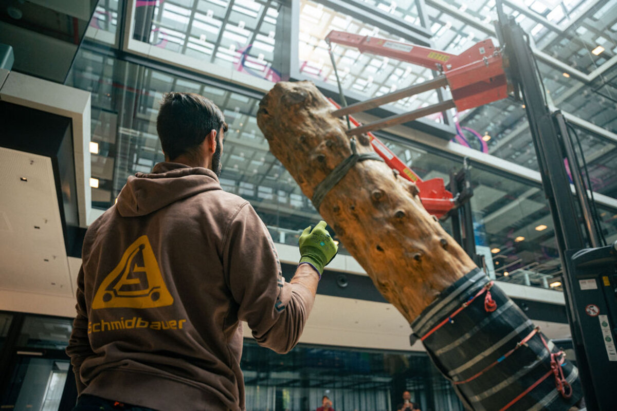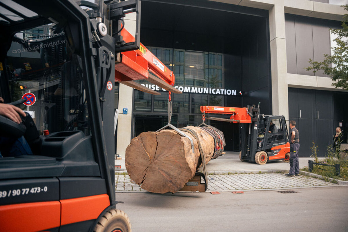 Das war auch der Grund, warum die Serviceplan Group, einer der größten Werbe- und Kommunikationsdienstleister in Europa, auf die Erfahrung und Kompetenz von Schmidbauer setzte. Es ging darum, die aus einem massiven Baumstamm gefertigte, rund sechs Meter hohe Holzskulptur sicher und absolut beschädigungsfrei in ihren Münchener Hauptsitz anzuliefern und aufzustellen.