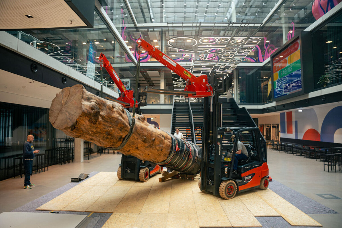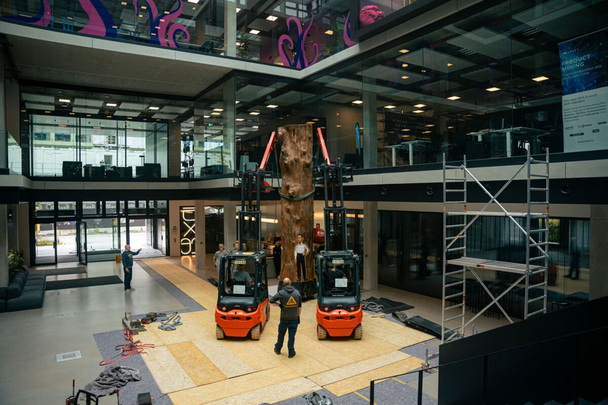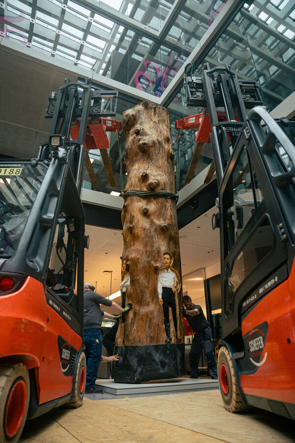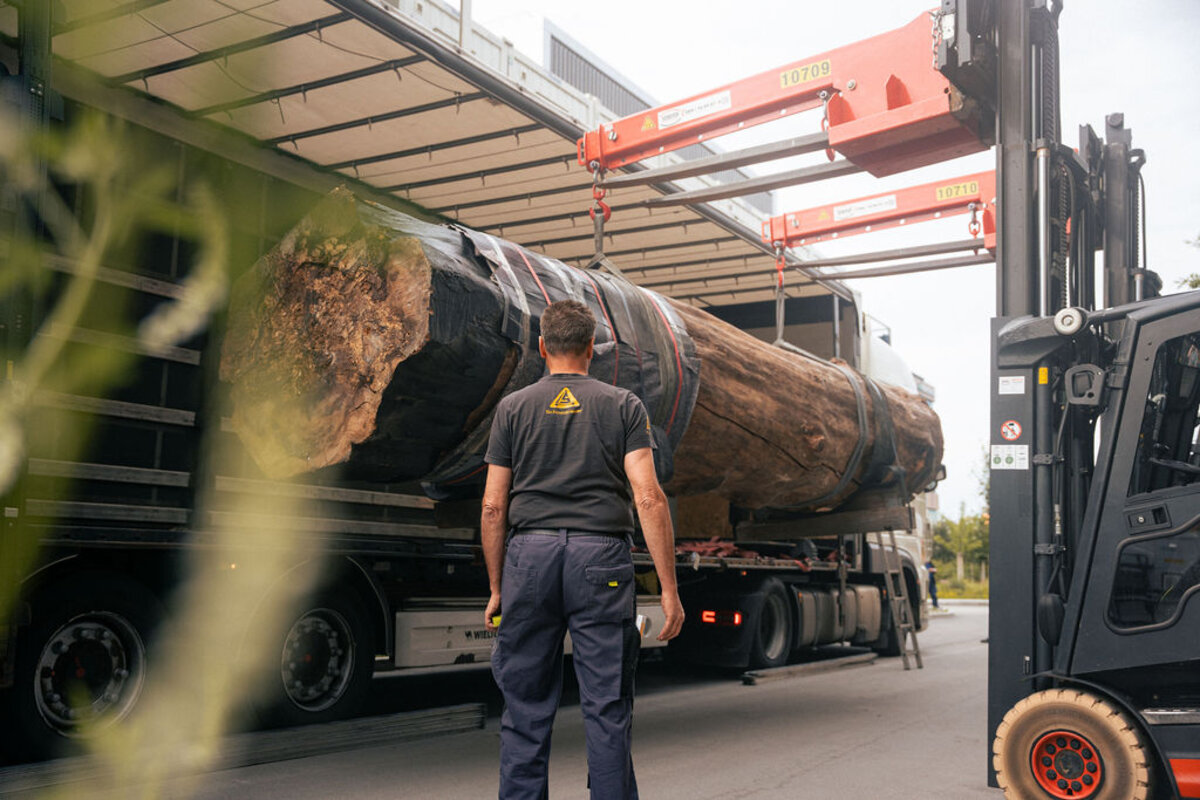 Das war auch der Grund, warum die Serviceplan Group, einer der größten Werbe- und Kommunikationsdienstleister in Europa, auf die Erfahrung und Kompetenz von Schmidbauer setzte. Es ging darum, die aus einem massiven Baumstamm gefertigte, rund sechs Meter hohe Holzskulptur sicher und absolut beschädigungsfrei in ihren Münchener Hauptsitz anzuliefern und aufzustellen.