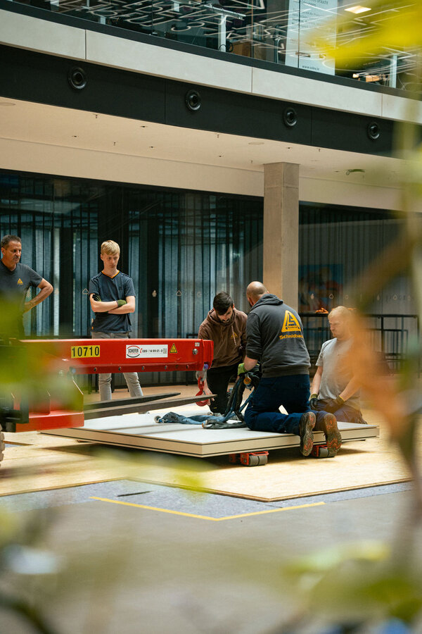 Im Inneren des Gebäudes war nicht minder Umsicht erforderlich. Zum Schutz des empfindlichen Bodenbelags war der Transportweg mit Malervlies und insgesamt 80 Grobspanplatten ausgelegt, über die die tonnenschwere Last gerollt wurde.