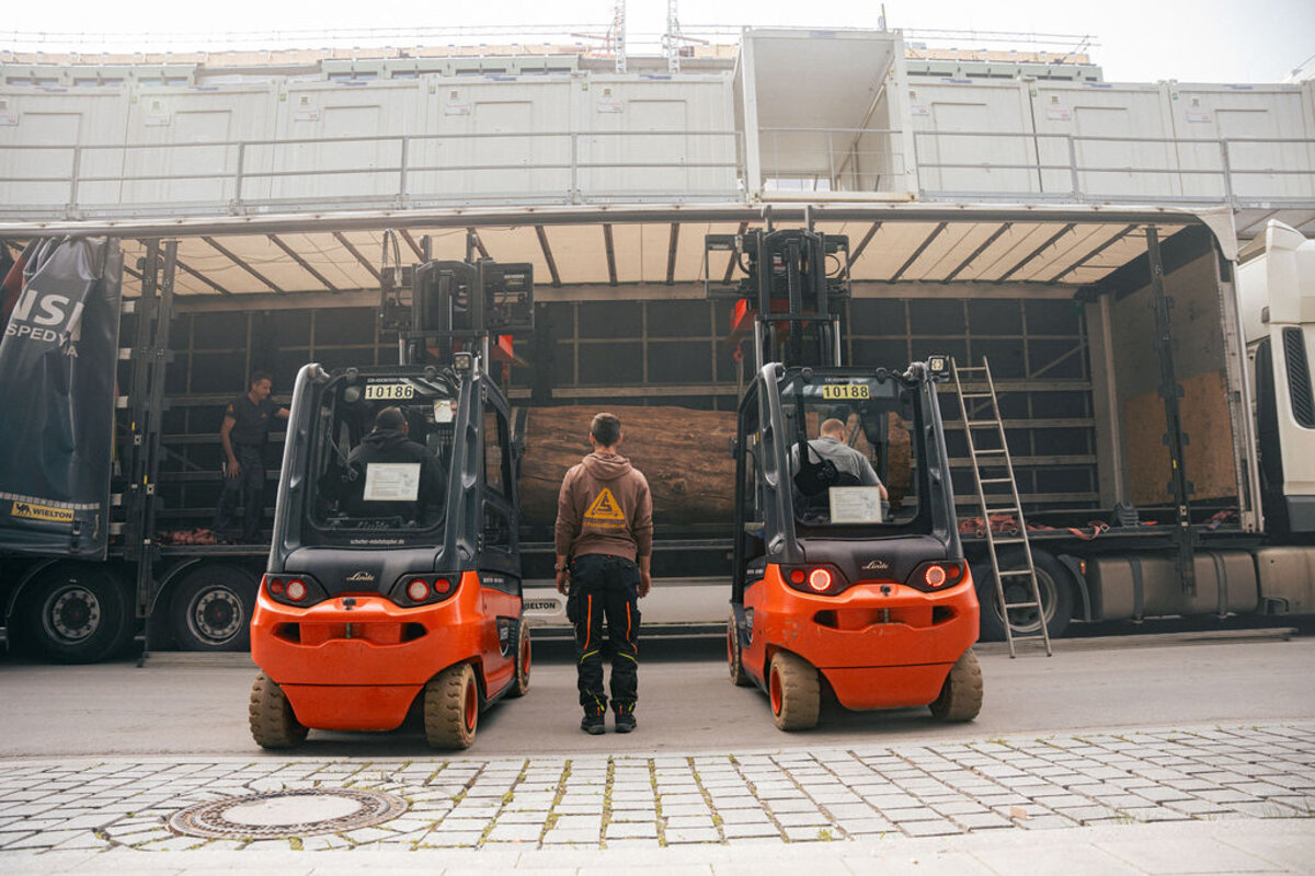 Eine besondere Herausforderung für das Schmidbauer Montageteam war es, die Skulptur sicher in die Vertikale zu bringen. Hier kamen erneut die beiden Elektrostapler zum Einsatz, mit deren Hilfe die Profis den Baumstamm absolut synchron anhoben und aufrichteten. Anschließend setzten sie das Kunstwerk zentimetergenau in seine Endposition auf den vorbereiteten Sockel. Kurze Zeit später war auch der Fahrbelag zurückgebaut und der Tatort gereinigt.