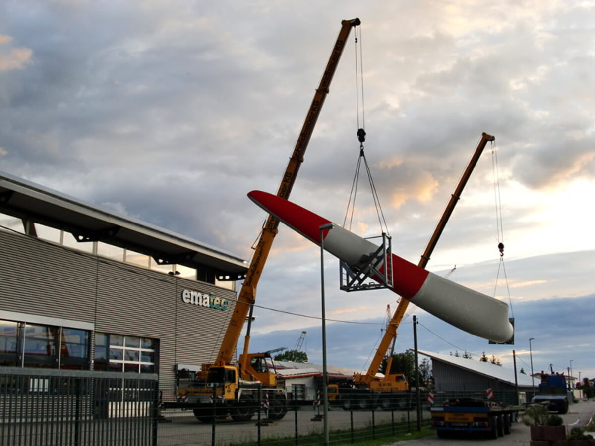 Zunächst stand die Verladung der Rotorblatttraverse (30 Tonnen) mit zwei Mobilkranen in der Halle an. Anschließend musste sie auf das Hofgelände transportiert werden.