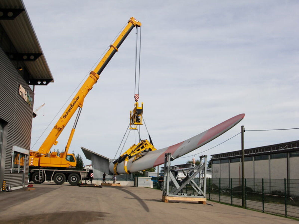 Dort wurde die kranbare Traverse mithilfe eines 220-Tonnen-Mobilkranes sowie einer separaten Fernbedienung ausgiebig getestet. Für den Test wurde ein 58,5 Meter langes Rotorblatt (10 Tonnen) des Herstellers Nordex verwendet. In zahlreichen verschiedenen Varianten wurde der Test durchgeführt und das Produkt so auf Herz und Nieren getestet.