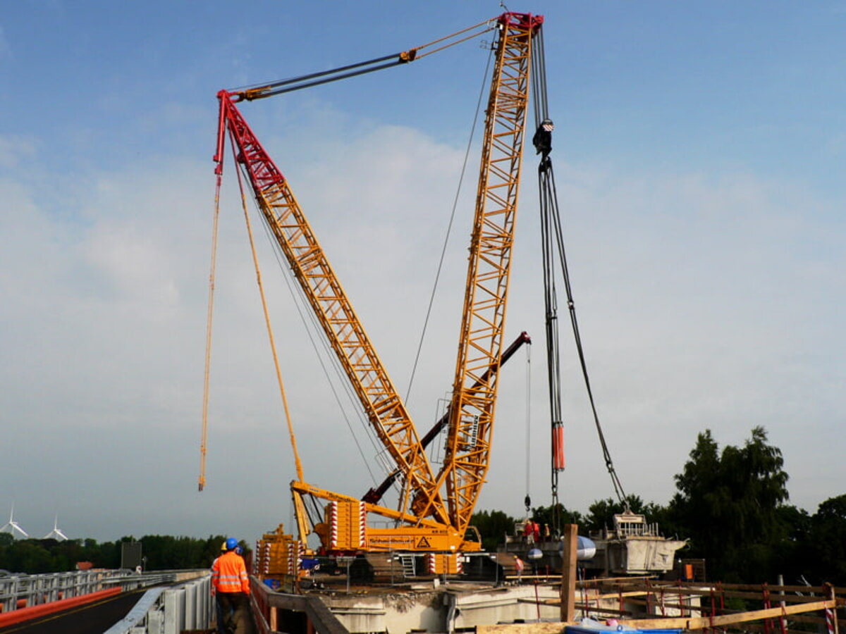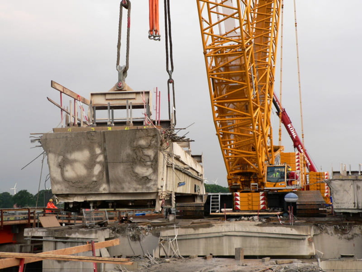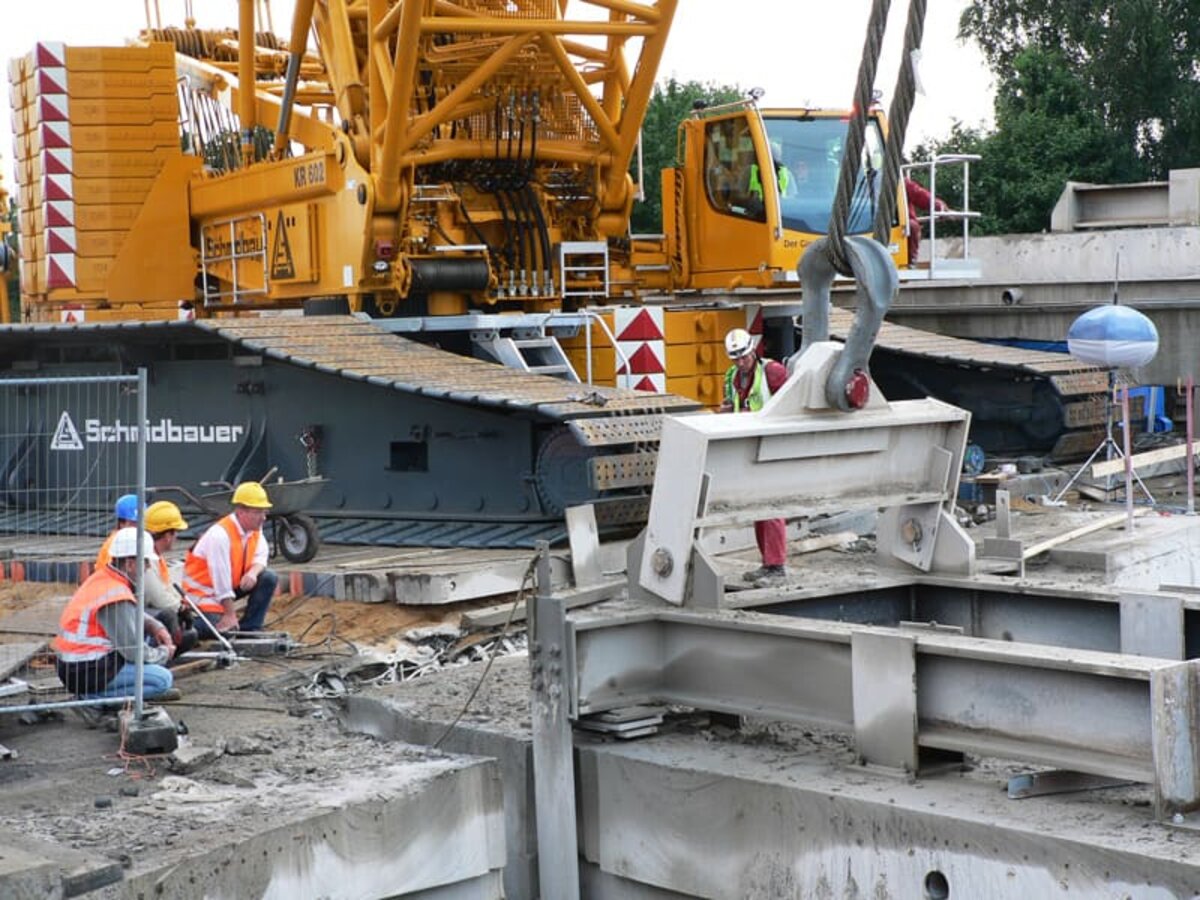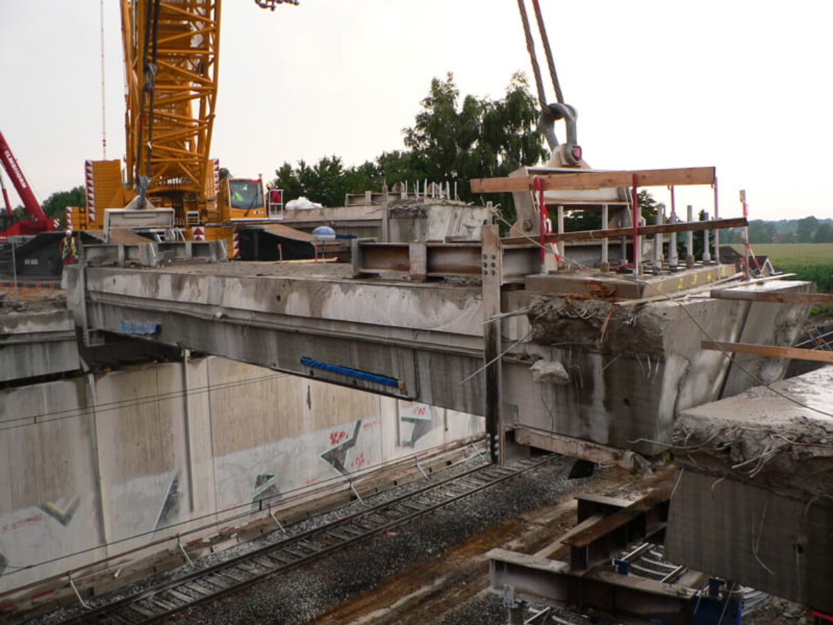 Insbesondere die Tragfähigkeit der Widerlagerkammerwand bereitete anfänglich Probleme. Nach umfangreichen Vorplanungen jedoch konnte der 600-Tonnen-Raupenkran (LR 1600/2) seinen Platz einnehmen – doch dann ging die Arbeit erst los: Betonsägen hatten die beiden zentralen Träger der Brücke freigelegt, damit diese von der LR 1600/2 herausgehoben werden konnten. Die 25 Meter langen und 380 Tonnen schweren Träger wurden auf der Autobahn abgelegt – währenddessen musste der Verkehr über eine Behelfsbrücke an der Baustelle vorbeigeführt werden. Auch der Schienenverkehr musste zeitweise gesperrt werden – was die Intervalle, in der die Arbeit ausgeführt werden konnte, in ein enges zeitliches Korsett schnürte. Nichtsdestotrotz konnten innerhalb von 3 Tagen insgesamt 6 Hübe mit Lasten im Bereich von 160 und 380 Tonnen durchgeführt werden.