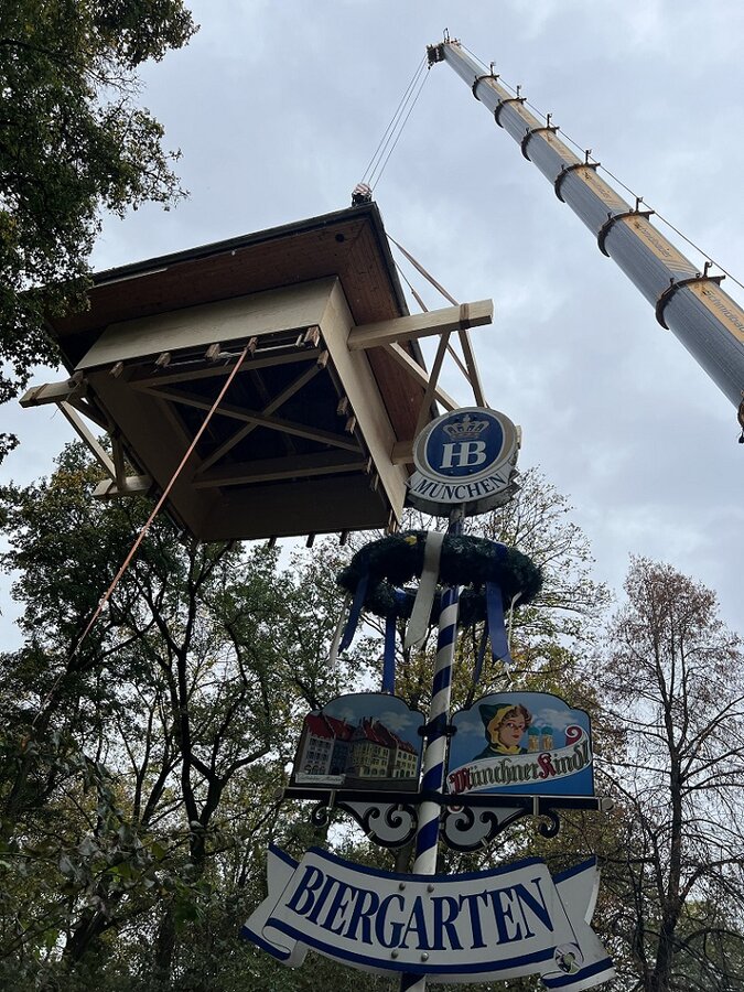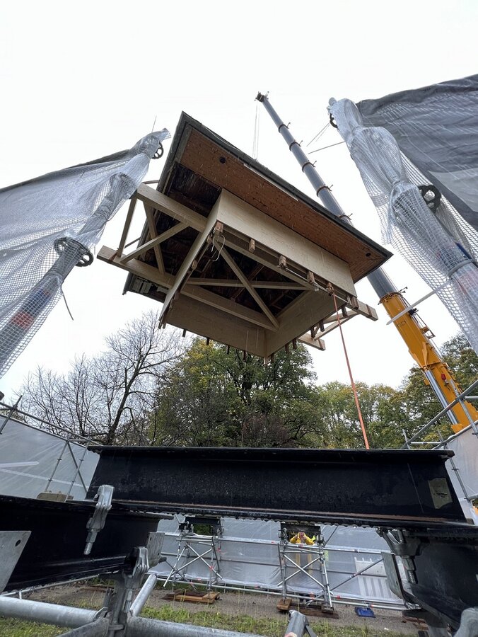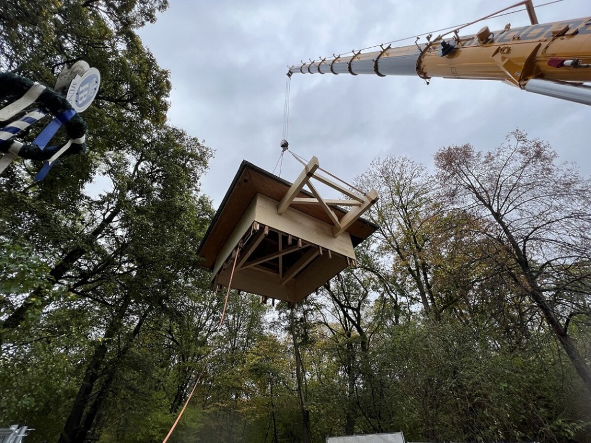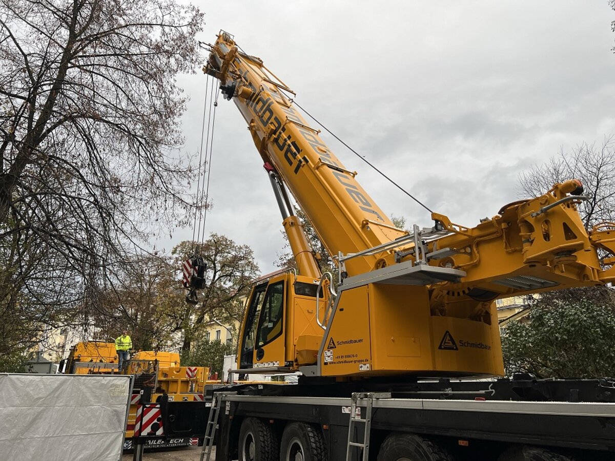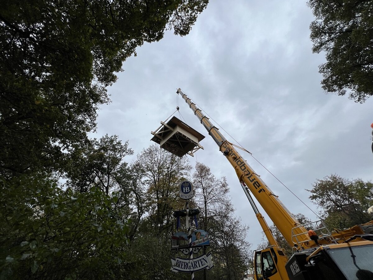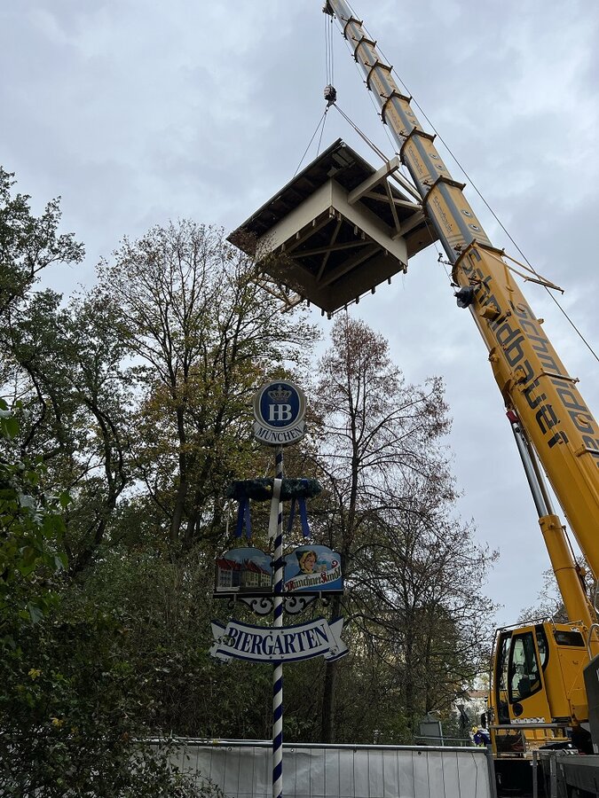 Das “Milchhäusl” – ein Münchner Café und Kult-Kiosk im Englischen Garten – braucht in Zukunft zusätzliche Lagerfläche. Seit 2013 plant Wirt Axel Bansemir deshalb den Umbau: Ein Keller soll her. Damit das funktioniert, hat Schmidbauer kräftig angepackt. Das Häuschen mit einem stolzen Gewicht von ca. 10 t wurde einfach “ausgeflogen”. In einem Stück hob der LTM 1230-5.1 den Kiosk an und schwenkte ihn in 30 bis 40 Metern Höhe in Richtung seines Lagerplatzes. Dort wurde das Häuschen auf ein vorbereitetes Gerüst gesetzt – wo es jetzt wartet, bis der 60qm große Keller entstanden ist. Für Anfang Januar 2023 ist der Rückflug auf den alten Platz gebucht. Passanten hatten Spaß an diesem Einsatz und waren beeindruckt, den Kiosk mit der an japanische Architektur erinnernden Dachform am Eingang zum Englischen Garten schweben zu sehen. Wenn Axel Bansemir am 01. April die Wiedereröffnung des Bio-Kiosks mit einem kleinen Fest feiert, wird sie sich für viele Gäste nach einem Aprilscherz anhören: die Umbau-Reise des “Milchhäusl”.