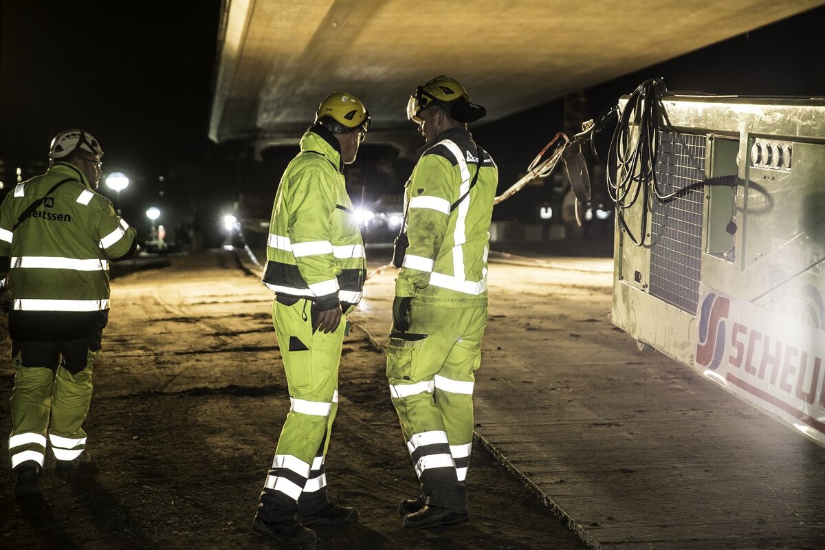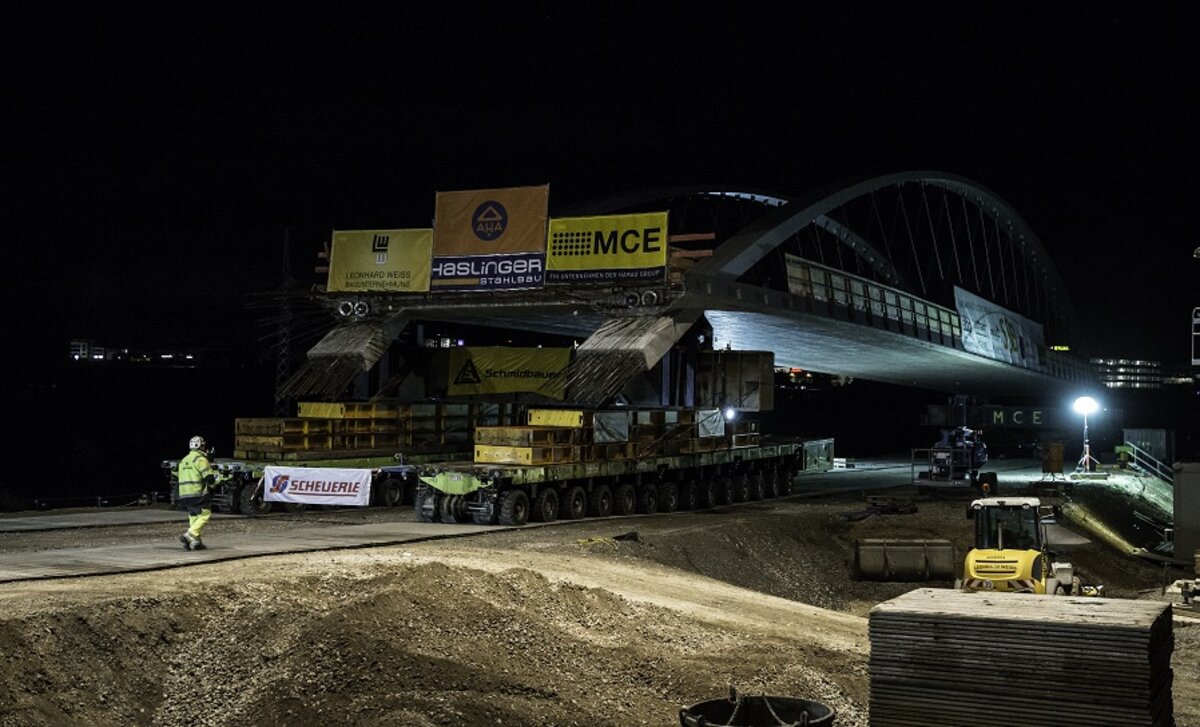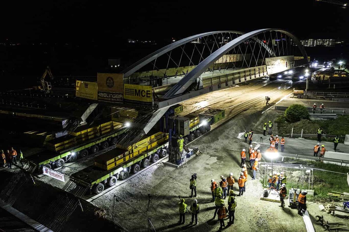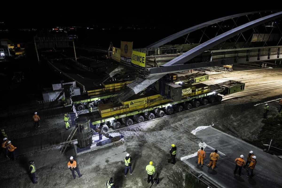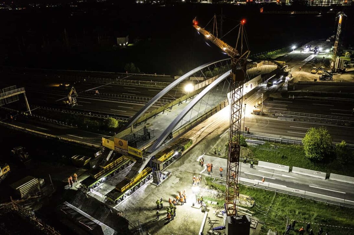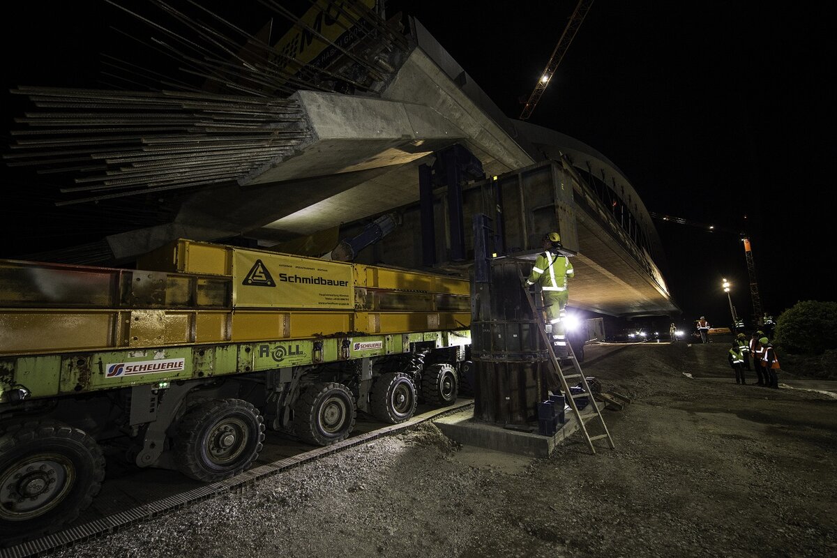 Die Brücke wurde auf Spezialfahrzeuge und mithilfe von insgesamt 50 Mitarbeitern mehrerer Gewerke über die Autobahn geschoben. Vier Schwerlastmodultransporter (SPMTs) mit 2000 Pferdestärken und 224 Reifen bewegten die Brücke im Schneckentempo quer über die Autobahn. Lediglich 20 Minuten brauchte das Bauwerk, das in neun Monaten direkt neben der Autobahn vorgefertigt wurde, bis es die SPMTs an den Tragjochen aufnahmen und über die Autobahn schoben. In Zeitlupentempo von weniger als einem Kilometer pro Stunde – und dennoch stand der Hauptteil der Brücke bereits um ca. 4 Uhr am Sonntagmorgen in endgültiger Position auf provisorischen Stützen.