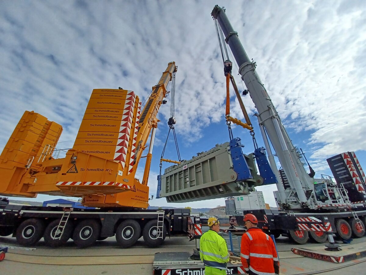 In Regensburg wurde der Transformator auf einen speziellen 32-achsigen Eisenbahntragschnabelwagen umgeladen, der in der Lage war, den Zielort zu erreichen. Während des Umladevorgangs auf den Eisenbahntragschnabelwagen war äußerste Vorsicht geboten, da ein Tandemhub mit zwei LTM 1650-8.1 ausgeführt wurde. Hierbei musste darauf geachtet werden, dass beide Krane die gleiche Last heben, um ein Ungleichgewicht zu vermeiden.