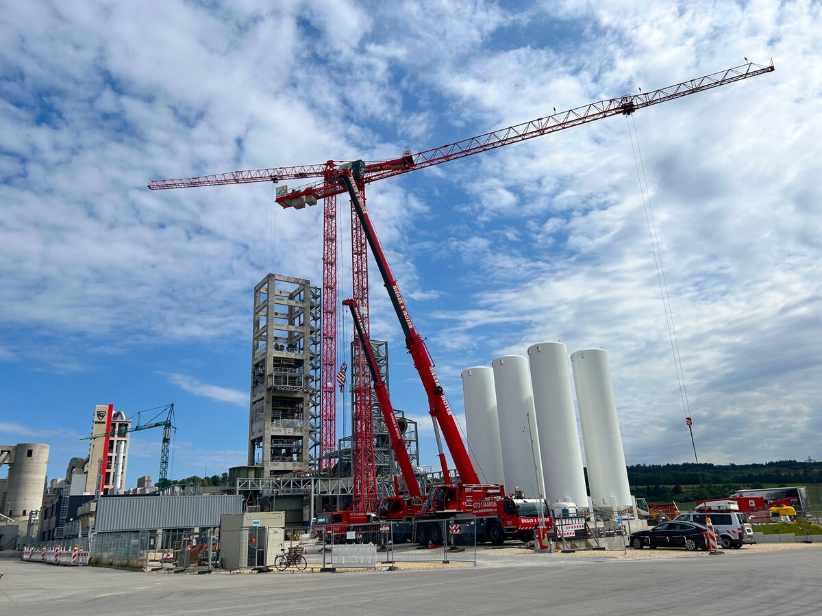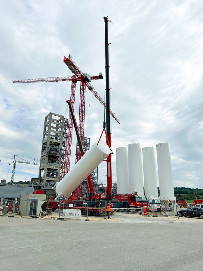 Was ein Ofenrohr ist, weiß jeder. Aber was bitteschön ist ein Drehofenrohr? Das ist, einfach gesagt, das zentrale Bauteil eines Drehrohrofens. Solch ein zylindrischer Ofen, der sich im Betrieb kontinuierlich um die eigene Achse dreht, kommt beispielsweise bei der Zementherstellung zum Einsatz. Und genau das wird auch der Drehrohrofen tun, den Schmidbauer im März 2024 beim Schwenk Zement in Mergelstetten bei Heidenheim eingesetzt hat. Allerdings nicht primär zur Produktion von Zement, sondern für einen höheren Zweck.