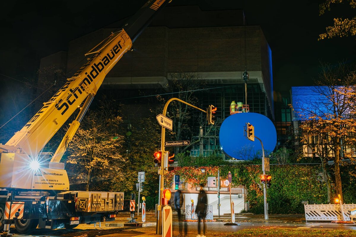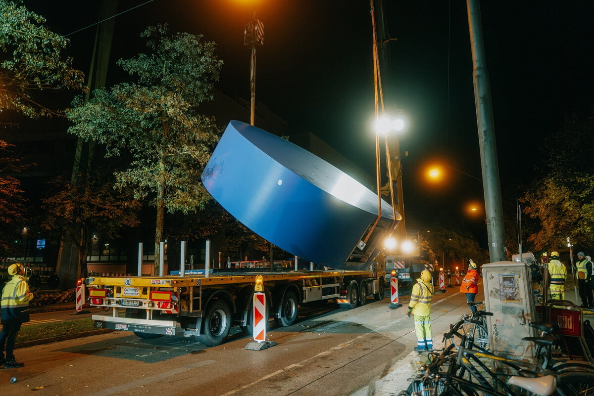 Dank Schmidbauer steht die circa 6,20 Meter breite Stahlblechskulptur ab sofort vor dem Gasteig HP8 und ist der neue Blickfang in München Sendling. In der Nacht von Samstag auf Sonntag wurde die 13,5 Tonnen schwere Konstruktion mittels Kran hochgehoben und ohne Demontage der Oberleitungen durch die Münchener Innenstadt transportiert. Die Rosenheimerstraße blieb die ganze Nacht über befahrbar und musste nicht gesperrt werden. Wenn das Haupthaus des Gasteigs wieder in neuem Glanz erstrahlt, dann gehört auch wieder „Das gerundete Blau als Wahrzeichen an den alten Standort.