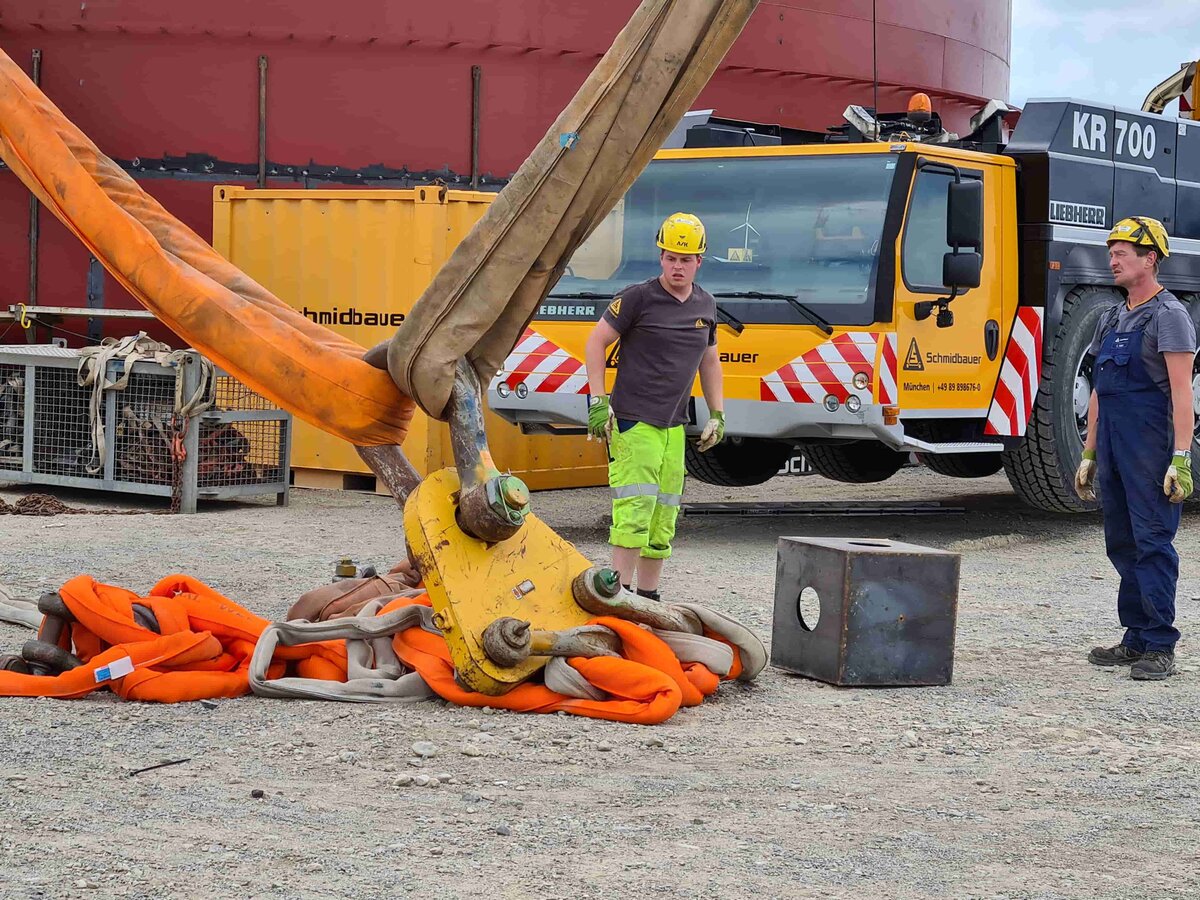 Ein Auftrag, der die Faktoren Kraft und Präzision in Form eines sogenannten Tandemhub-Verfahrens auf nicht alltägliche Weise miteinander verband. Dabei nahmen die Schmidbauer-Profis die gigantische stählerne Tonne synchron von zwei Seiten mit je einem LTM 1650 8.1 Mobilkran (700 Tonnen Tragkraft) an den Haken und hoben sie millimetergenau auf die berechnete Höhe an. Vierzehn Anschlagpunkte stellten dabei sicher, dass der Speicher absolut stabil und exakt über dem darunter eingeschobenen neuen Segment positioniert war. Nur so war eine präzise Verschweißung möglich.