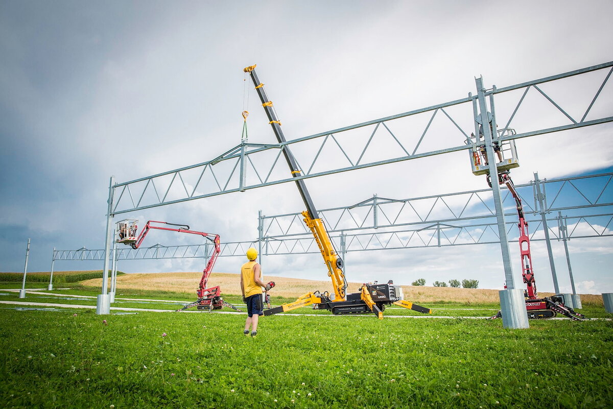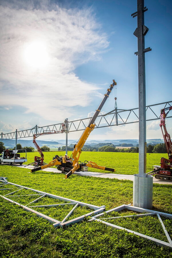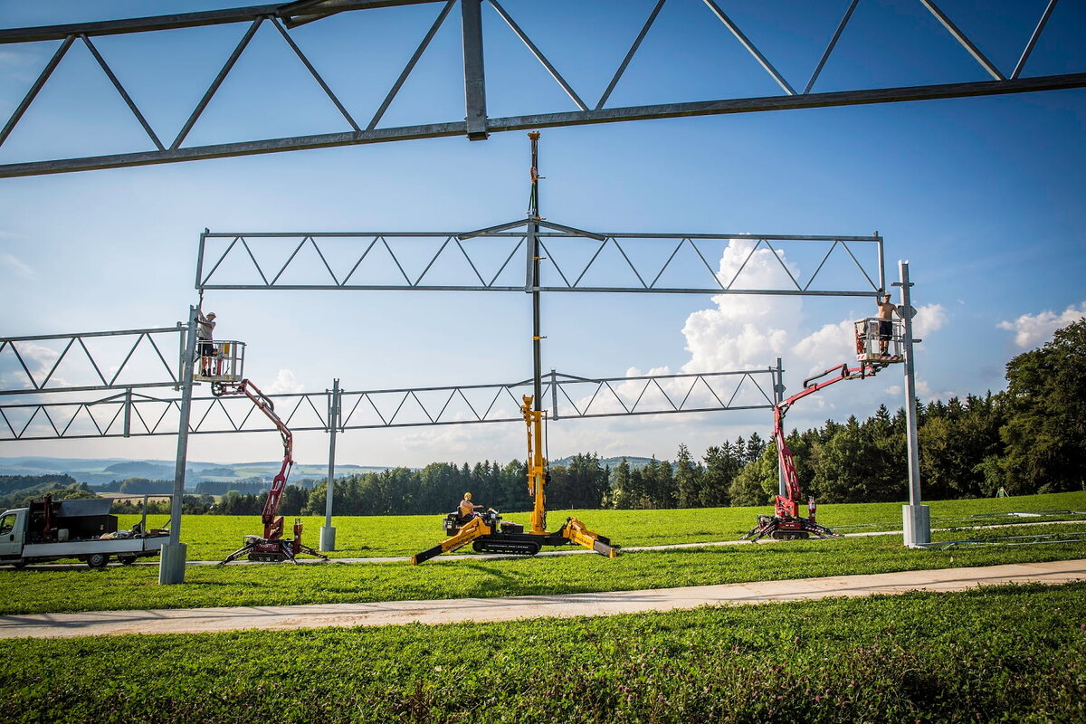 Errichten des Ständergestells der ersten Agrarphotovoltaik-Großanlage Deutschlands in Herdwangen-Schönach (12 km nördlich des Bodensees)