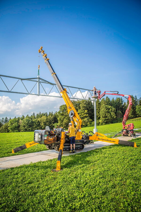 Das Aufstellen dieses neuartigen, hoch über der Erde gelegenen Ständergestells oblag unserem Haus. Aufgrund des unwegsamen Geländes und der Notwendigkeit zum häufigen Umsetzen des Krans hatten wir uns zum Einsatz des Unic Minikrans entschieden, der den Anforderungen zum Errichten des Ständergestells, u.a. durch seine Raupe, hervorragend gewachsen war.