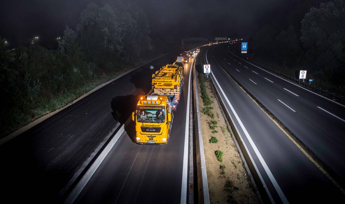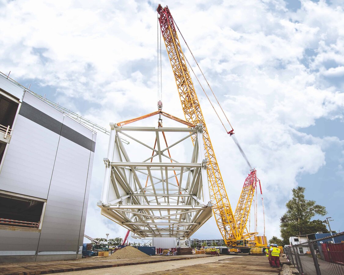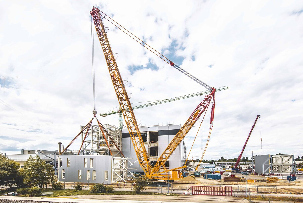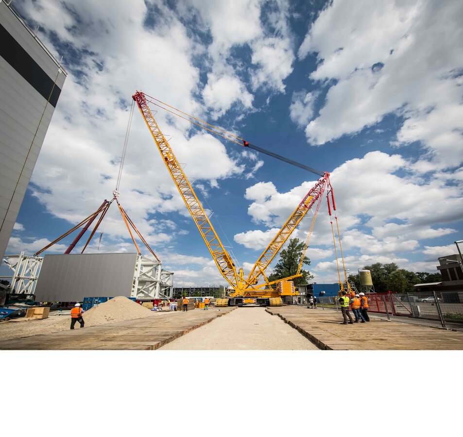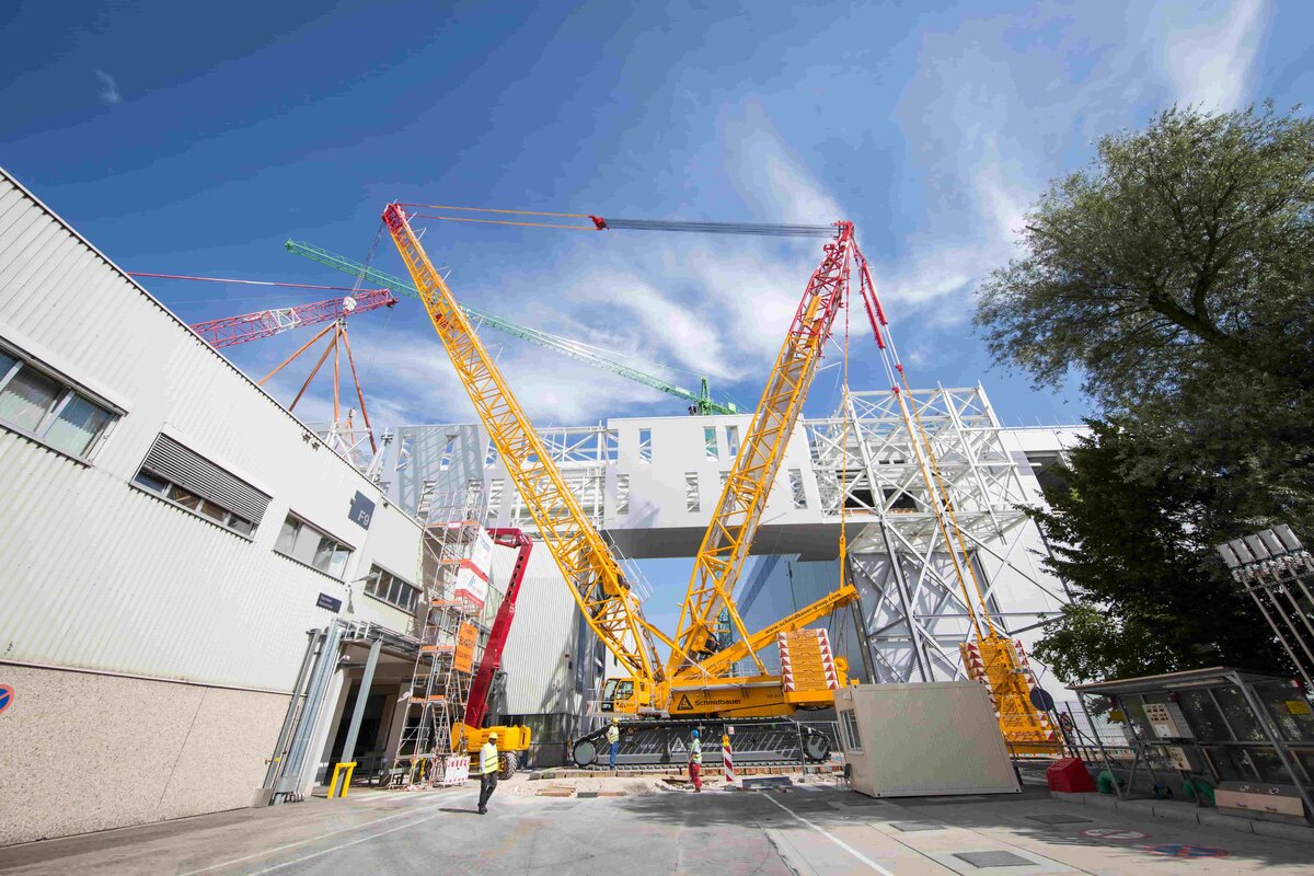 Der CC 3800-1 wurde vom Hersteller in Zweibrücken zu seinem ersten Einsatzort nach Karlsfeld bei München transportiert. Sowohl das Grundgerät mit 80 t Ladungsgewicht als auch die beiden Raupenträger mit jeweils 42 t Ladungsgewicht transportierte Schmidbauer mit hauseigenem Transportequipment. Vor Ort lautete der Auftrag, Stahlbaukonstruktionen einer Förderbrücke mit einem Hubgewicht von bis zu 125 t bei 35 m Ausladung zu heben. Um die freitragenden Konstruktionen zusammenfügen zu können, wurden diese gleichzeitig vom 650 t Gittermast-Raupenkran (Demag CC 3800-1) und unserem 500 t Teleskopkran (Demag AC 500-2) eingehoben.