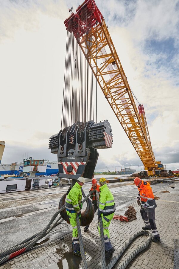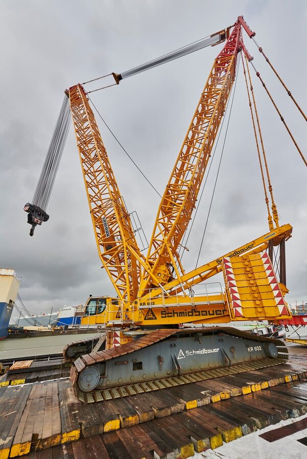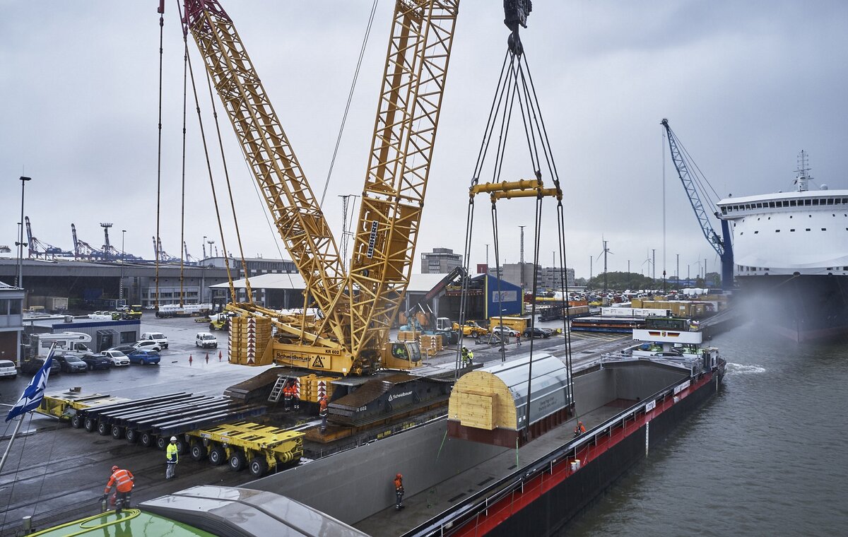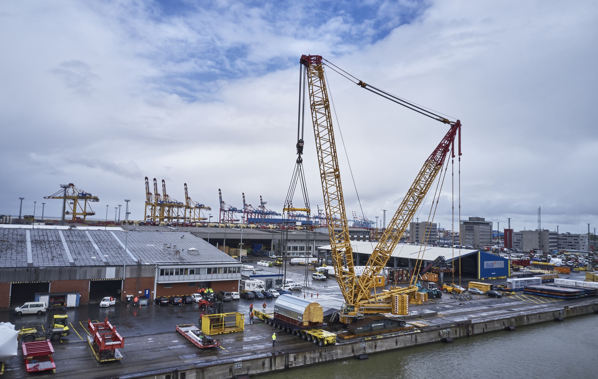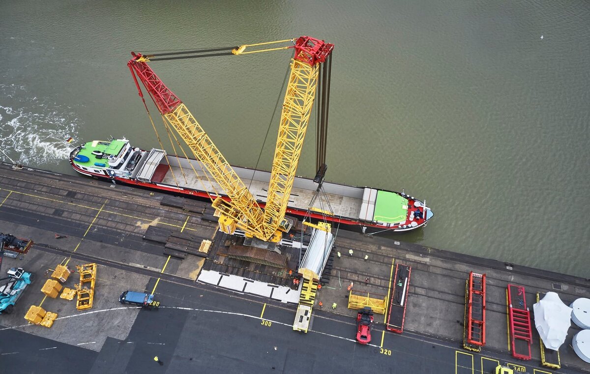 Eine 333 Tonnen schwere Turbine wurde mittels der SPMTs aus einem Ro-Ro-Schiff entladen. Das Gesamtgewicht der Kombination, einschließlich der Stahlträger und SPMTs, erreichte bis zu 462 Tonnen und stellte damit einen neuen Ro-Ro-Gewichtsrekord für das Terminal auf. Unser 600 Tonnen Liebherr-Raupenkran LR1600/2 hob die Turbine dann von den SMPTs auf ein Binnenschiff für den Weitertransport nach Berlin.