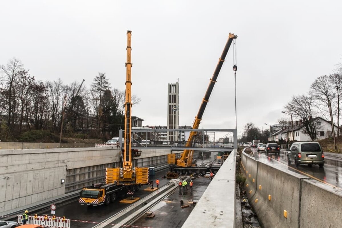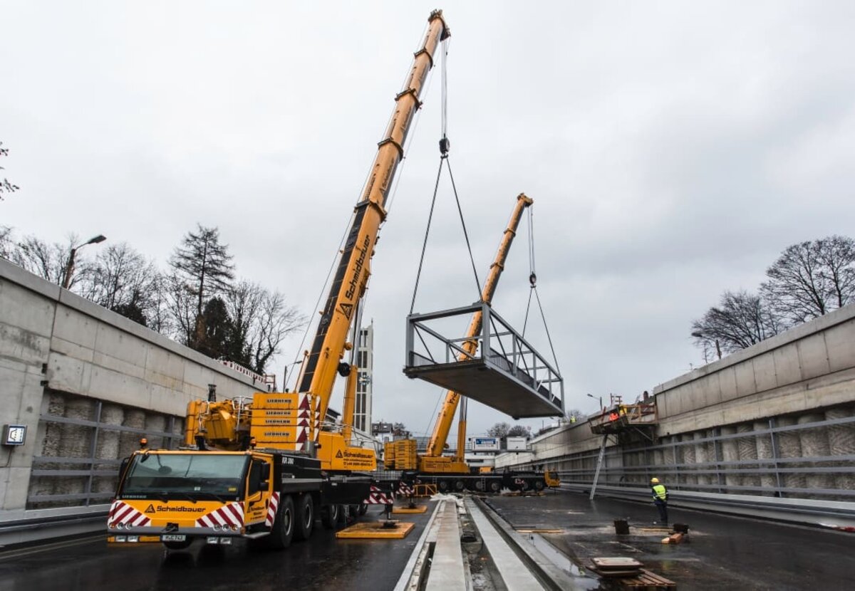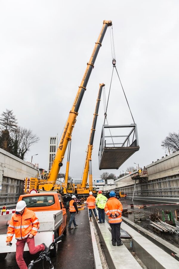 Die Anfahrt der beiden Krane, ein 400 t- und ein 350 t-Teleskopkran, erfolgte über den noch nicht in Betrieb genommenen Luise-Kiesselbach-Tunnel. Die anschließende Herausforderung war, die Abstützung der Krane im Graben so anzuordnen, dass keine Stützlasten in die Fundamente abgetragen werden. Dies war unbedingt notwendig, da die Straßenentwässerung und die Anprallschutzfundamente (Leitplanken) am Rand der Fahrbahnen bereits fertiggestellt waren und der hochfeste, wasserundurchlässige Beton in der Mitte der Fahrbahnen keine Setzung und Belastung vertragen hätte. Insofern mussten vor Ort die Kranstandplätze neu festgelegt werden. Dabei wurde für den 400 t-Kran eine provisorische Überfahrt geschaffen, die aufgrund der Höhendifferenz der Fahrbahnneigung höchste Ansprüche an das Fahrwerk des Liebherr-Kranes stellte. Die Überfahrt wurde gleichzeitig als Kranstandplatz genutzt. Im Tandemhub wurde nun die Brücke eingesetzt.