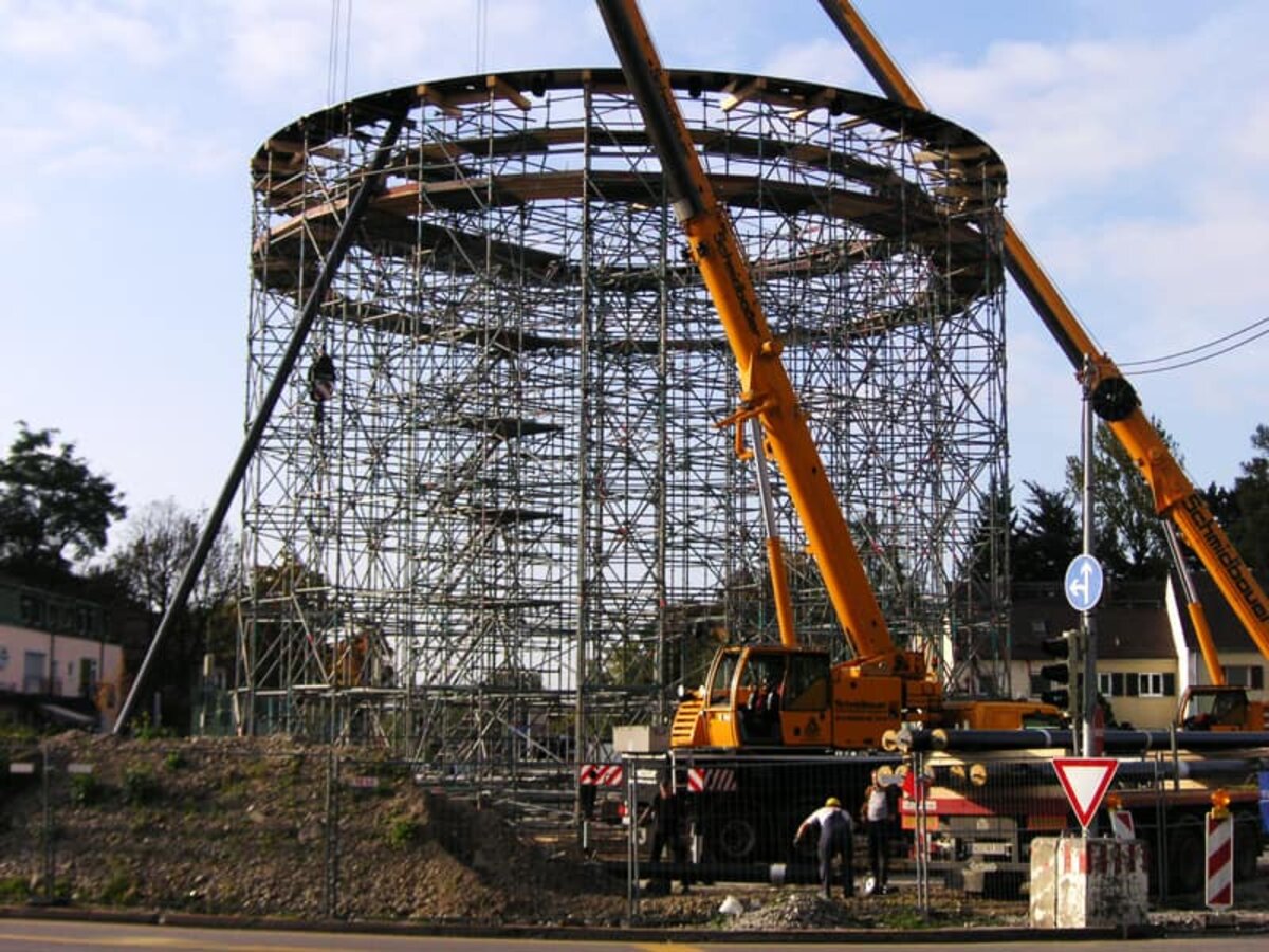 Auch der verwendete Werkstoff stellte uns vor besondere Herausforderungen: aufgrund der geringen Verformbarkeit mussten sehr geringe Toleranzen für das Einheben des Oberteiles eingehalten werden; zudem durfte das Bauteil ausschließlich am unteren Tragring angeschlagen werden. Realisiert wurde dies mittels 8 Anschlagpunkten sowie jeweils 33 Meter langen Seilen.