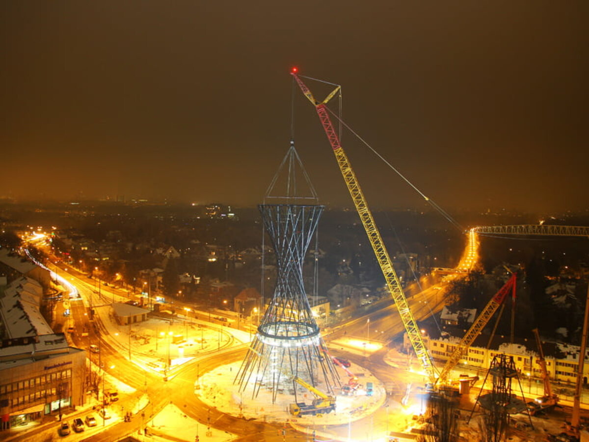 Unter ansprechender Beleuchtung wurde das Oberteil mit 57 Tonnen durch unseren 600-Tonnen-Raupenkran mit 84 Metern Hauptausleger sowie 12 Metern fester Spitze auf dem bereits auf dem Fundament montierten Unterteil von 15 Metern Höhe platziert.