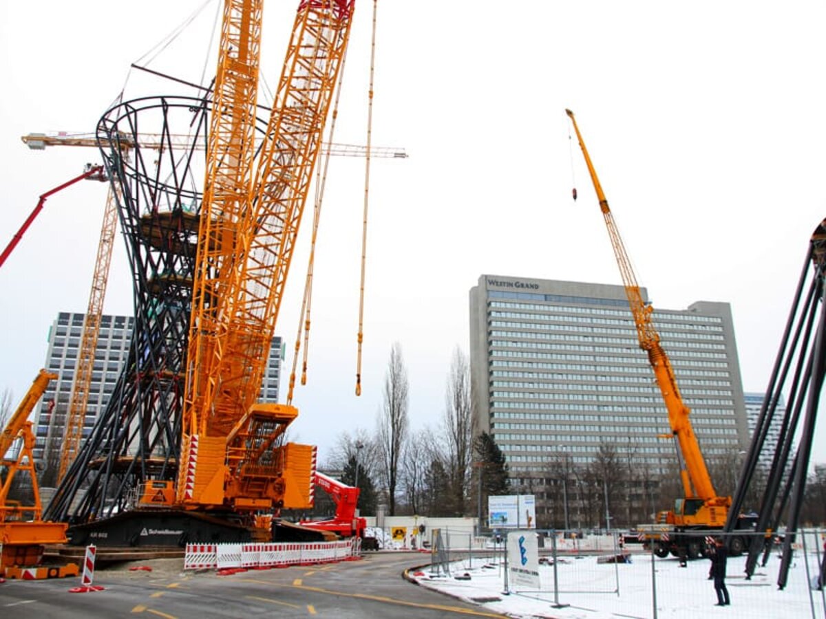 Für den Aufbau unseres 600-Tonnen-Raupenkranes (Liebherr LR 1600/2) mussten die Transporte der Teile punktgenau koordiniert werden, da vor Ort keine Möglichkeit zur Zwischenlagerung gegeben war. Erst kurzfristig fiel zudem die Zustimmung zur Sperrung einer Fahrspur der Effnerstraße, des Kreisverkehrs sowie einer Bushaltestellte, die im Rahmen des Hubs unerlässlich waren.