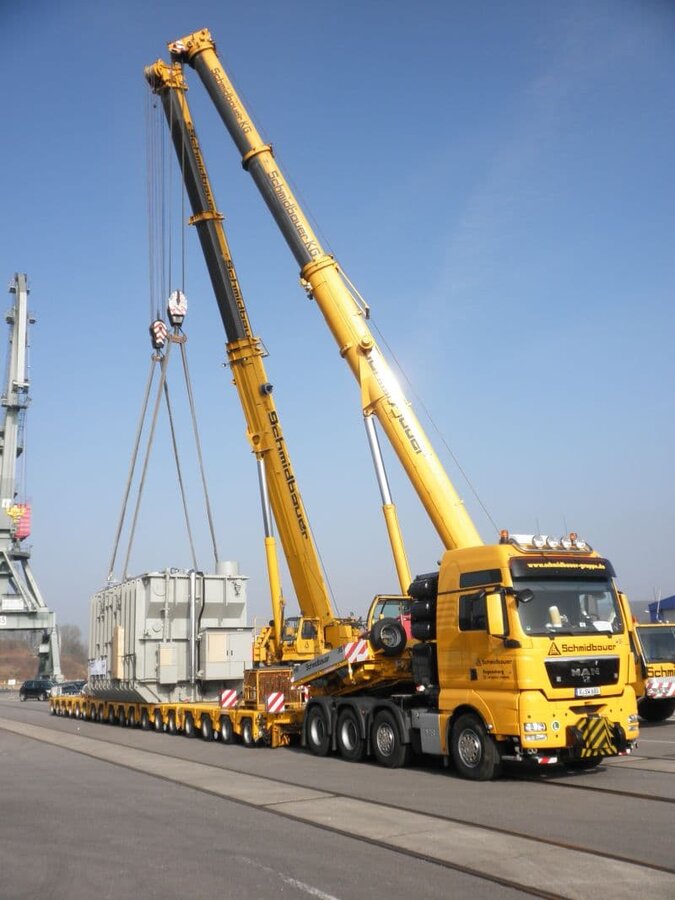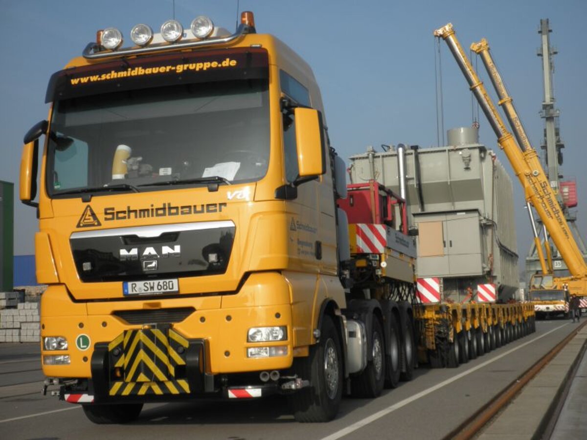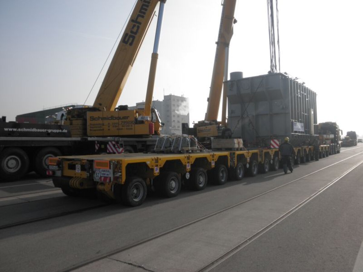 Der 150 Tonnen schwere Transformator wurde am 15.03.2012 mit Hilfe zweier Autokrane aus dem Werk der Firma Starkstrom-Gerätebau GmbH auf einen Tieflader verladen und anschließend zum Regensburger Osthafen transportiert.