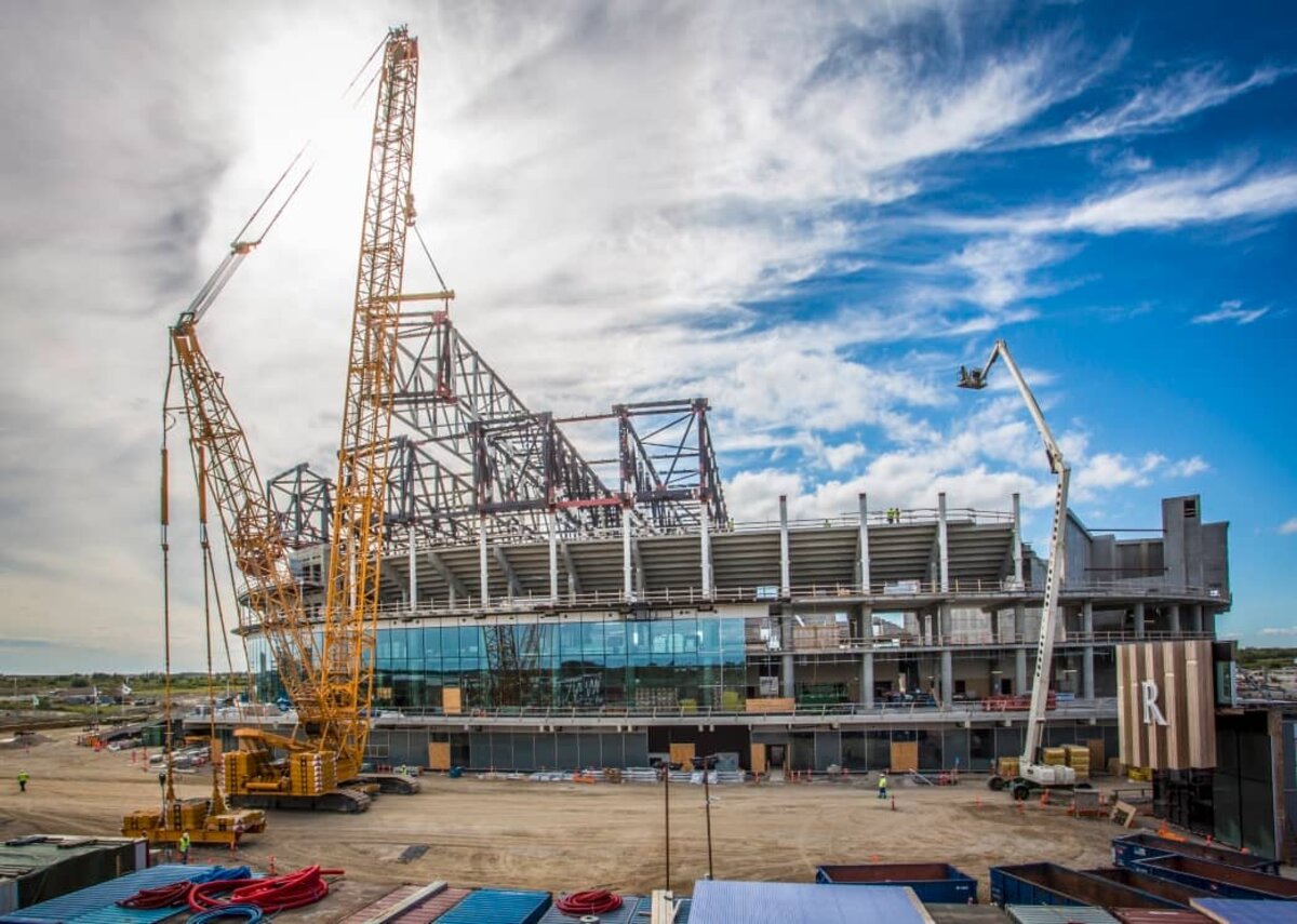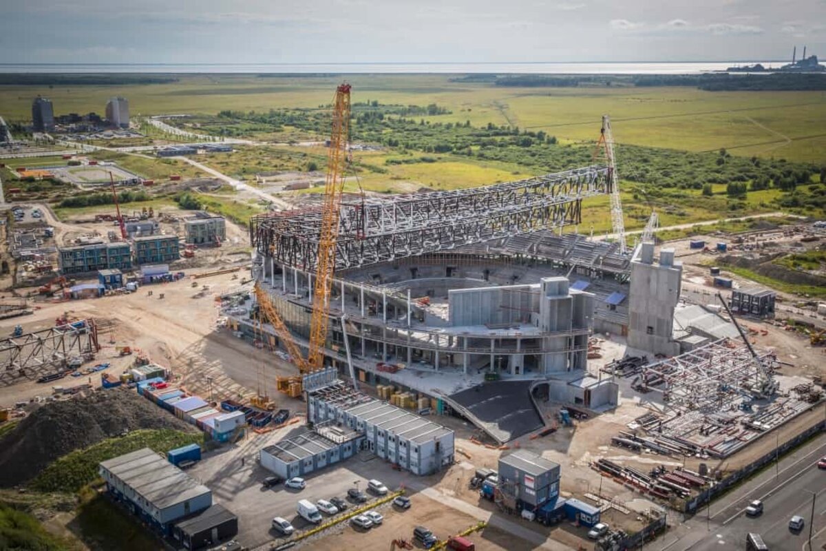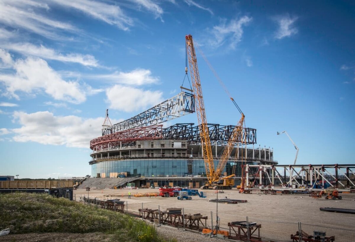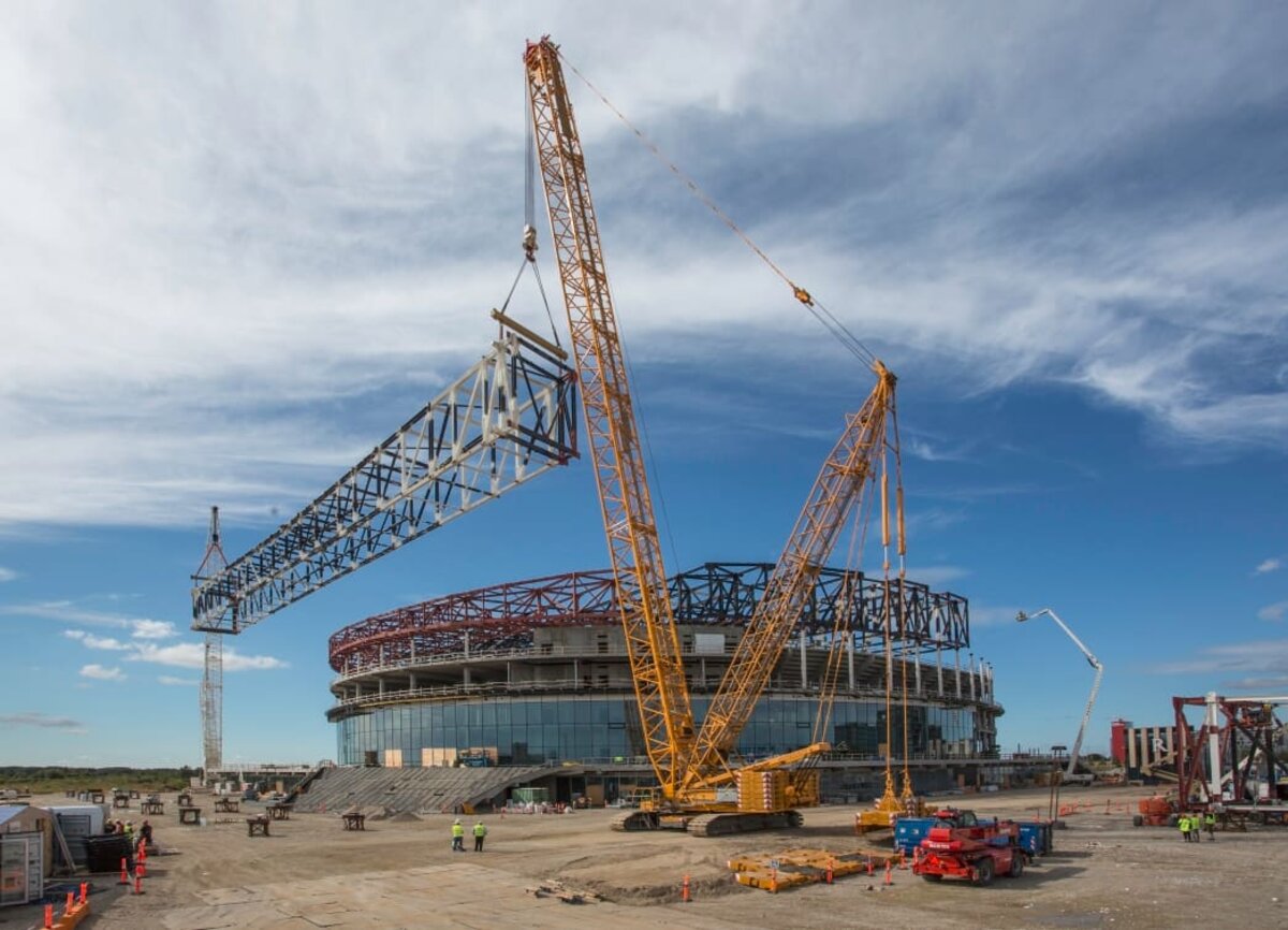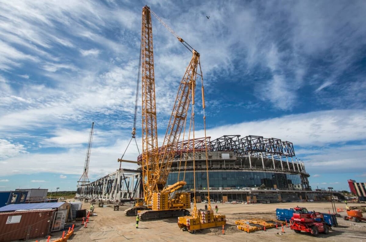 Schmidbauer wurde beauftragt, zusammen mit einer LR 1350/1 des Auftraggebers, neun Stahlträger der Dachkonstruktion zu heben. Wir hatten eine CC 2400-1 sowie 6 Achsen SPMT im Einsatz. Die bis zu 300 t schweren Stahlkonstruktionen wurden mittels der Raupenkrane auf bis zu 60 m Höhe gehoben, anschließend entlang des Stadions verfahren und abgelegt.