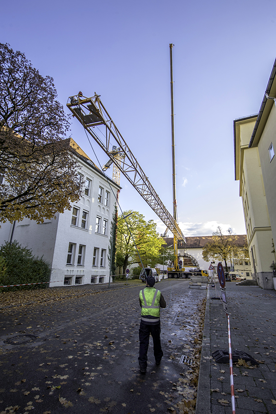 Und dabei war volle Kraft gefragt: Ein Baukran musste auf ein sechs Meter hohes Portal katapultiert und befestigt werden. Ende Oktober kam der Schwerlast-Experte auf der Baustelle zum Einsatz. Am 23.10. begann die Aktion mit der Vormontage des Portals. Dieses wurde mithilfe von 2 Kranen in die richtige Position gedreht. Am Folgetag wurde der Baukran durch die Krane von Schmidbauer montiert.