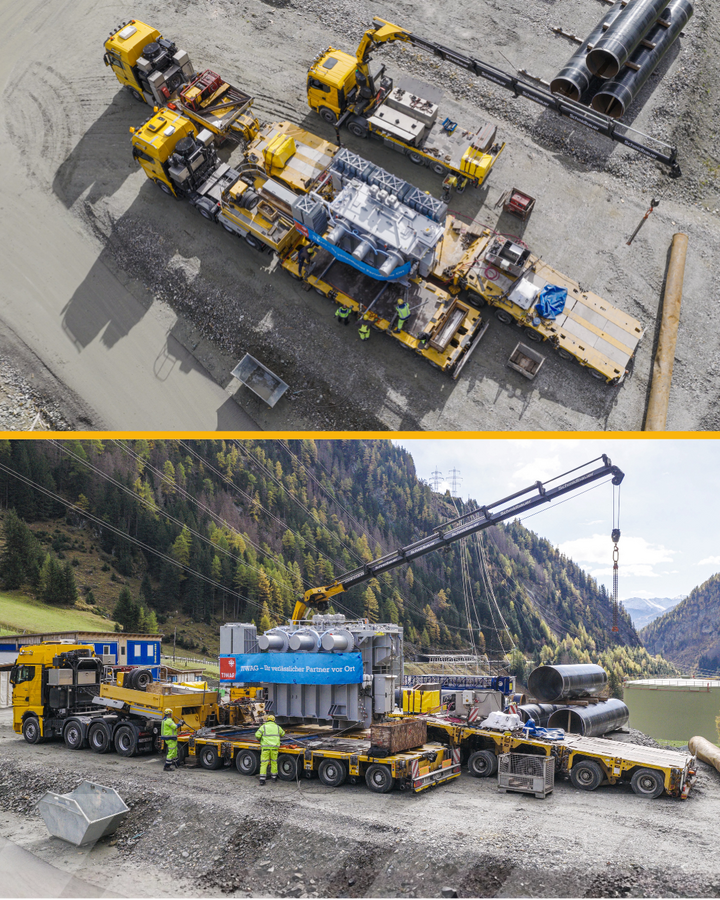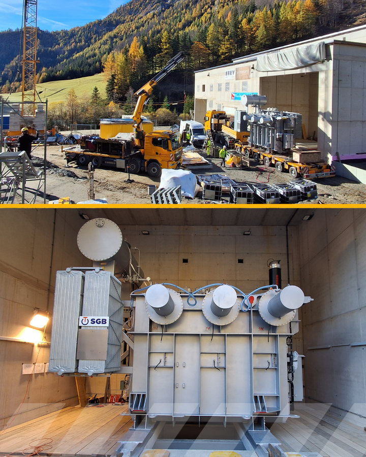 Der Transformator, hergestellt im bayerischen Regensburg, ist die elektrotechnische Schlüsselkomponente des neuen Kraftwerks. Seine termingerechte Anlieferung war Voraussetzung dafür, dass die elektrischen Installationen im Krafthaus planmäßig beginnen konnten. Schmidbauer stand dabei vor anspruchsvollen Bedingungen: alpine Lage, enge Zufahrt und höchste Präzision bei der Endmontage.