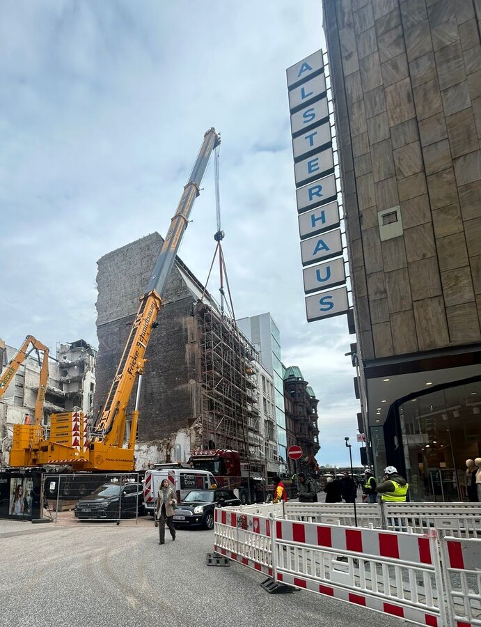 Mitten im Herzen der Hamburger Innenstadt, dort, wo enge Gassen, denkmalgeschützte Gebäude und ein stetiger Strom an Passanten zwischen Juwelieren und Boutiquen aufeinandertreffen, stand unser 650-t-Teleskopmobilkran bereit. Ziel war es, die bis zu 60 Tonnen schweren Fassadenelemente des historischen „Hamburger Hof“ sicher auszubauen.