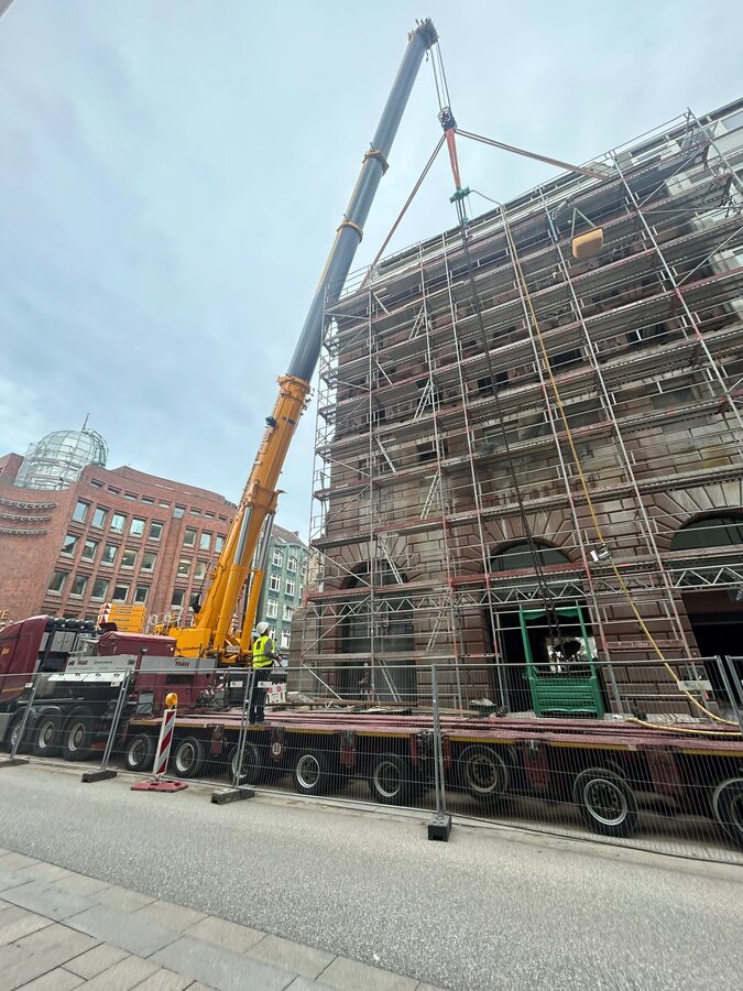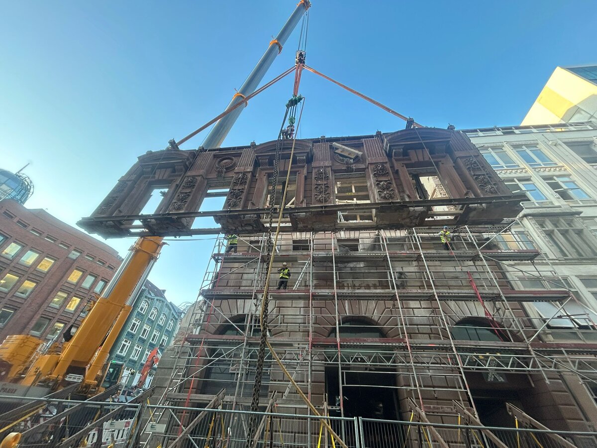 Die Fassadenelemente wurden erfolgreich ausgebaut, gesichert und zur fachgerechten Einlagerung transportiert. Damit beginnt ein neues Kapitel für den Hamburger Hof.