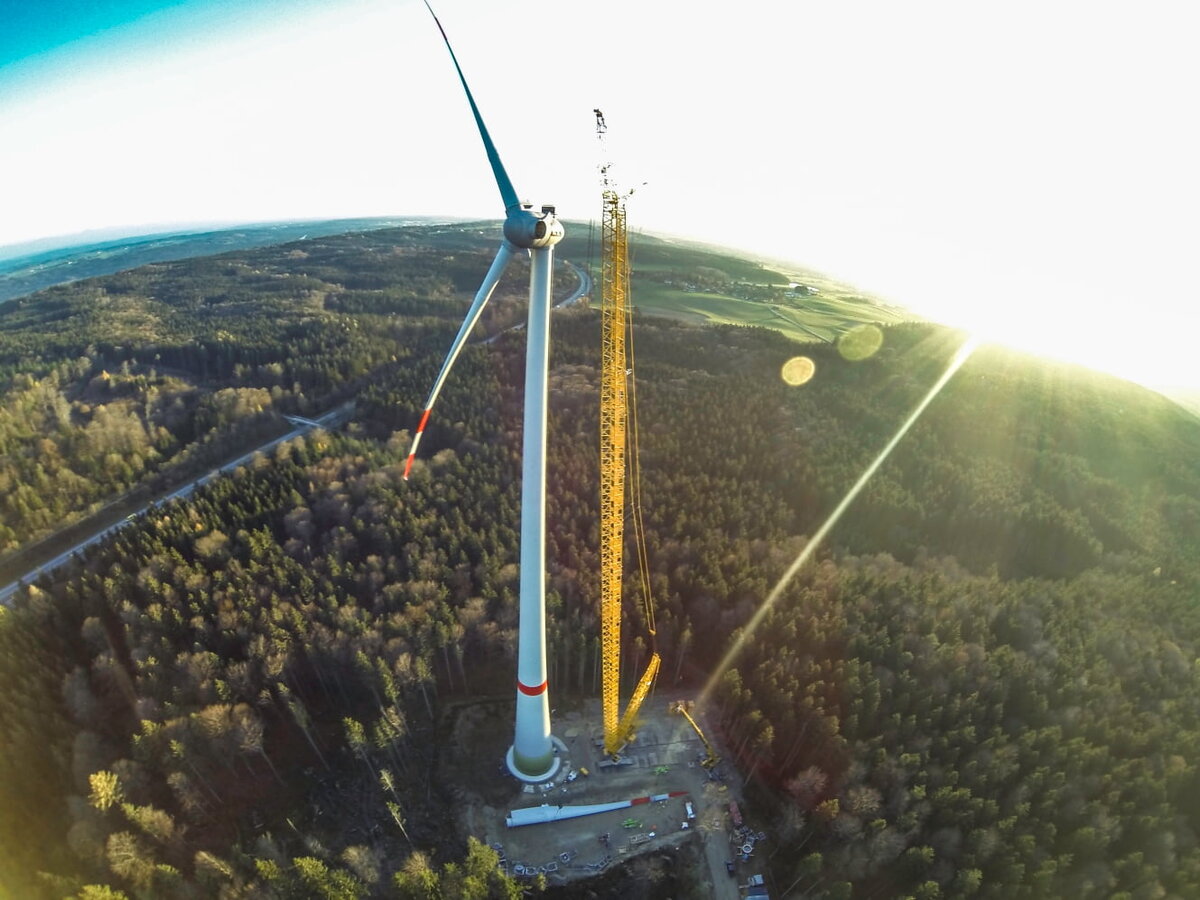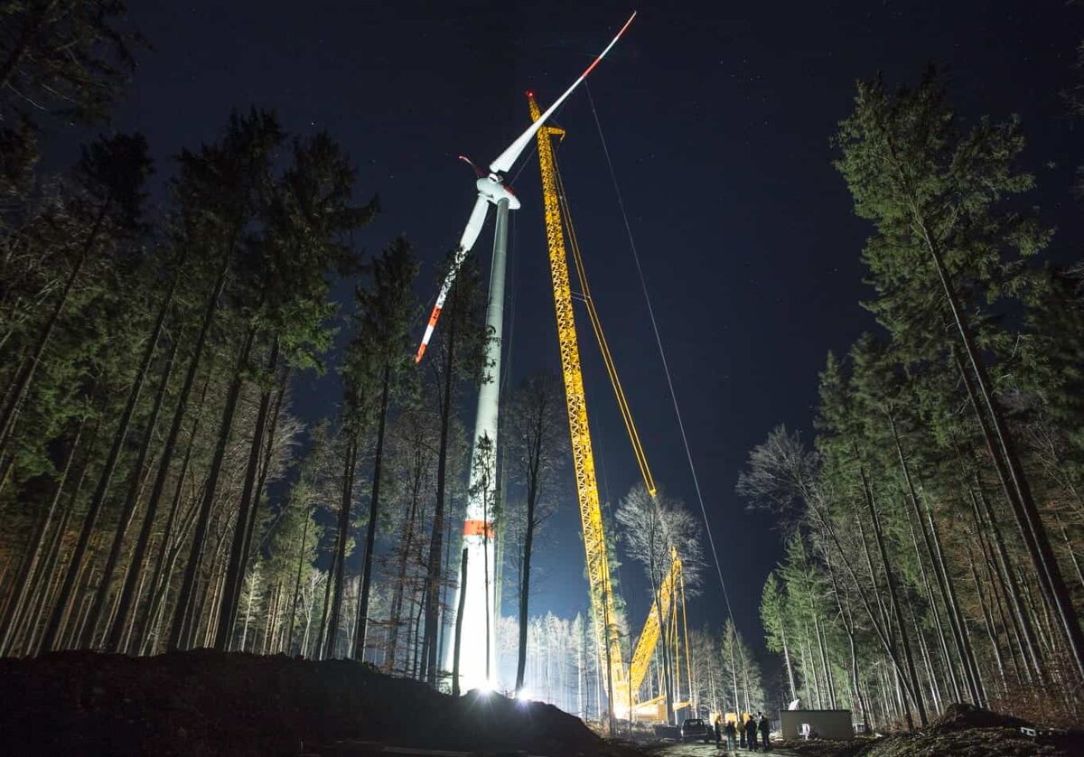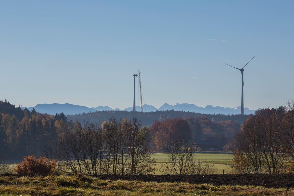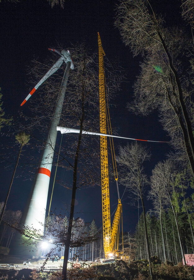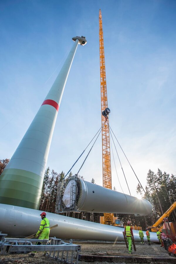 Nach der Errichtung der Beton-Türme hat die Schmidbauer-Gruppe die Aufgabe übernommen, jeweils die Stahlturmsektionen, die Gondeln und die Flügel mit ihrem Raupenkran LR1600/2 zu montieren. Die Gewichte der einzelnen Elemente waren: Stahlturm 54 t, Stator 58 t, Rotor 46 t, Nabe 58 t, Flügel je 27 t.