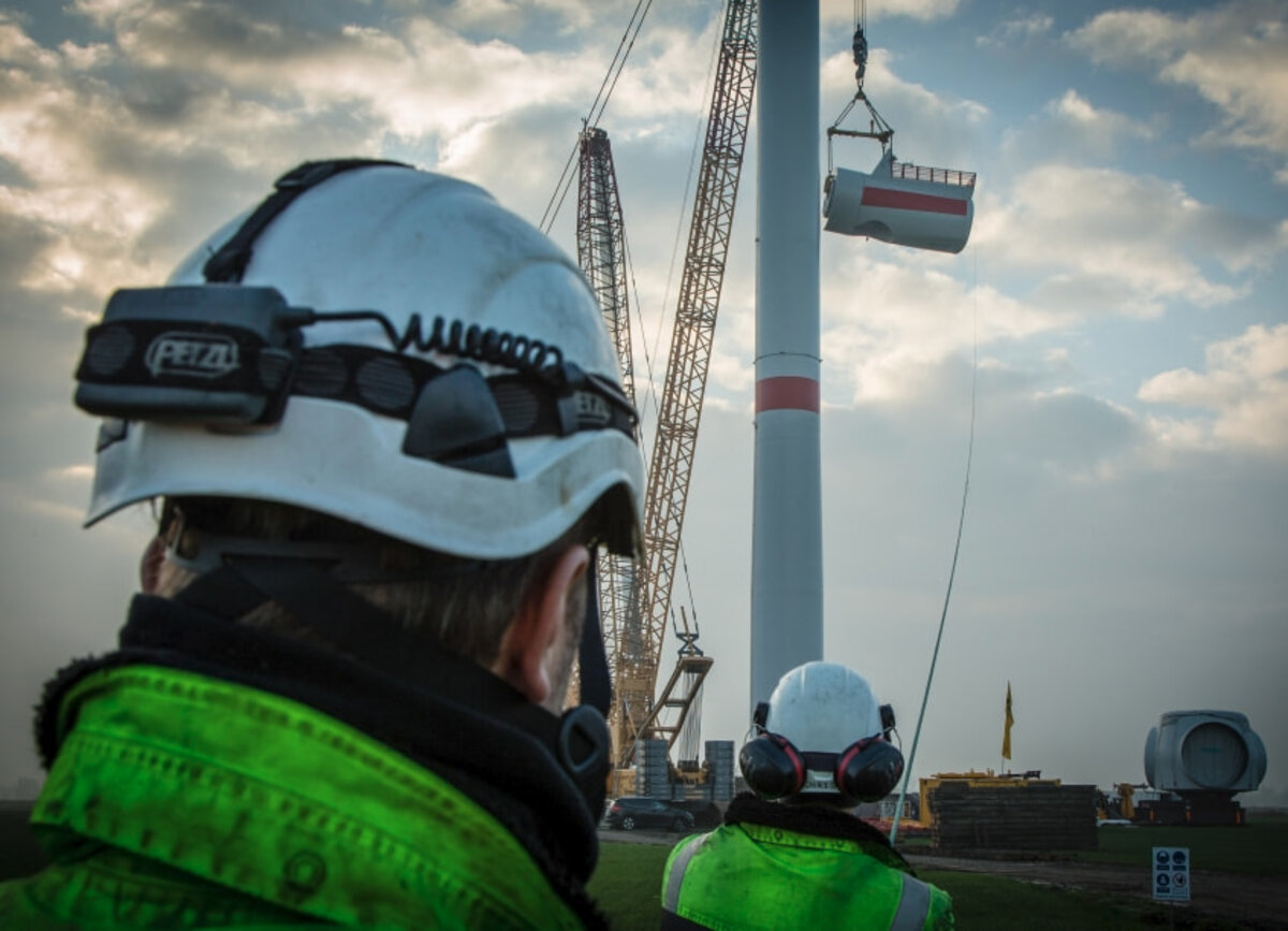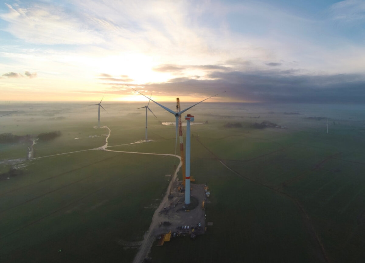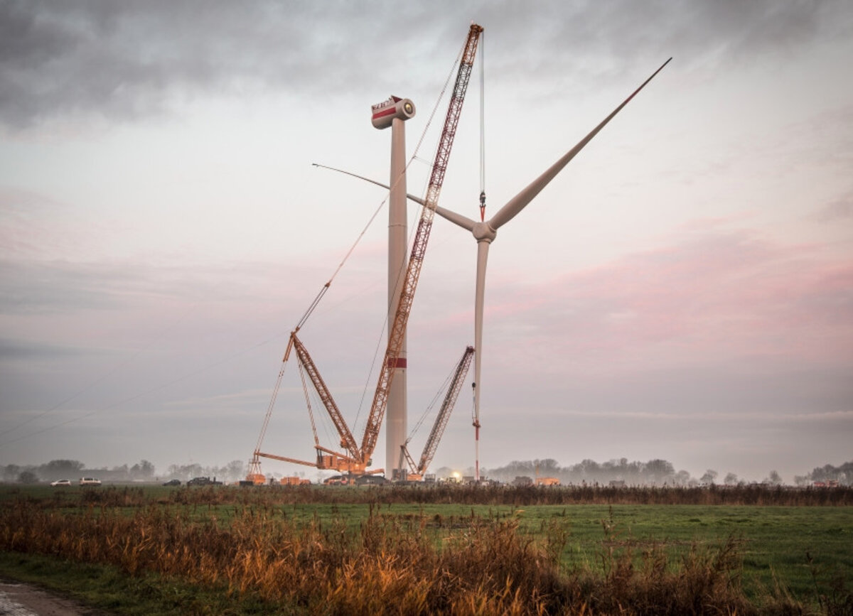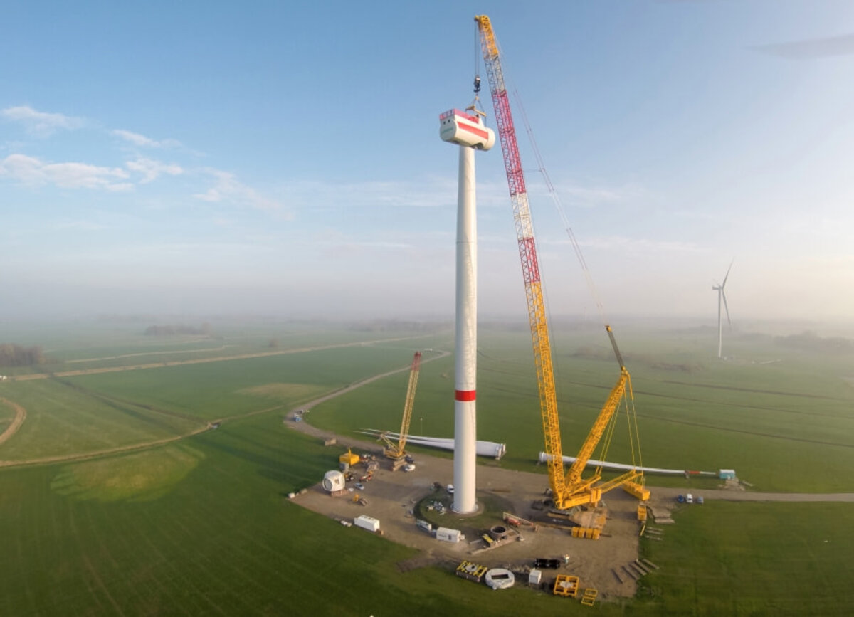 Der Raupenkran LR 11350 wurde mit SDB2 144 Meter ausgestattet. Die mittels Schwertransporte angelieferten Turmstücke mussten von der Horizontalen in die Vertikale gebracht werden. Hierfür wurden parallel ein Raupenkran LR 1280 (280 t) und ein 100 t-Teleskopkran eingesetzt. Diese Krane unterstützten auch den Großkran bei der Montage des kompletten Rotorsterns, der den gesamten Vormontageplatz ausfüllte. Es wurden eigene spezielle Lastverteilmatten eingesetzt, um die hohen auftretenden Stützdrucke zu kompensieren. Unter strengster Beachtung aller Sicherheitsvorgaben benötigte das Schmidbauer-Team für das Umsetzen vor Ort nur sieben statt der geplanten zehn Tage.